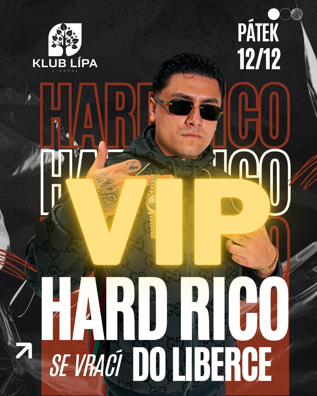 Hard Rico se vrací do Liberce!V pátek 12. 12. dorazí do Klubu Lípa a přiveze pořádnou show. Čeká tě noc plná rapu, energie a after party až do rána.🔥Speciální Meet & Greet🔥Obsahuje: drink zdarma, setkání s interpretem, zadní vstup do klubu, vlastní šatnu a vstup dříve než ostatní.
