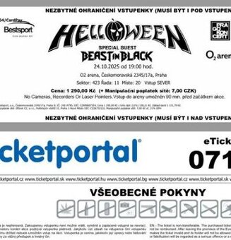 Prodám 1 vstupenku na koncert Helloween 24.10.