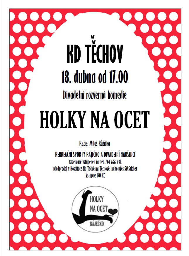 Ochotnické divadlo Ráječko.Příběh z prostředí fabriky a kasáren z osmdesátých let minulého století. Jak to udělat, aby nezůstaly hezké holky na ocet? Komedii napsali pánové František Zacharníka a Lubomír Veteška, režie Miloš Růžička. Bohatě obsazená komedie.Vstupné 150 Kč. Předprodej na tel. 724 266 931, v Hospůdce Na Točně na Těchově nebo přes SMS Ticket