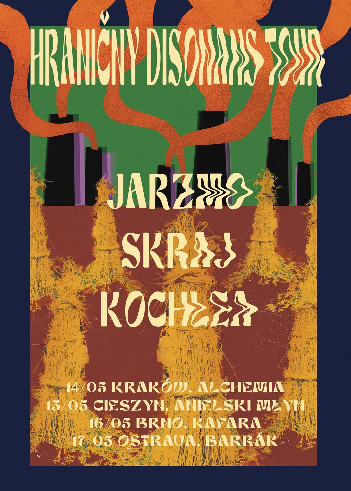 Hranicny Disonans je koncertní turné, které představuje tři kapely ze tří různých světů. Tři odlišné kouty světa a tři svébytné scény se spojují v jednom poselství: překračování hranic a hledání sebe sama uprostřed hluboké disonance dnešního světa.Potřeba spojovat v době rozdělování, budovat v době ničení, mluvit společným jazykem v době neporozumění. Je to výkřik imaginace, bratrství (i sesterství!) a lásky k přírodě.Celé turné vzniklo v duchu DIY – z potřeby srdce, spolupráce a čisté radosti.Protože všichni žijeme na hranicích.Jarzmo, pocházející z Malopolska, stojí od počátku své existence na rozcestí času a žánrů. Inspiruje se polskou tradiční hudbou, kterou však podává v originální a progresivní, do budoucnosti směřující podobě. Duo s nyckelharpou (klávesovou violou), bicími a dvěma hlasy čerpá také ze stonerové i noisové hudby, stejně jako z environmentálního aktivismu.Jarzmo BandcampJarzmo IGJarzmo FBKochlea je doma v moravském hlavním městě, hranice však už překročila mnohokrát. V jejich osobitém přístupu ke skládání a instrumentaci někteří slyší post-jazz, jiní kraut noir nebo post-rock s atmosférou zakouřených klubů. Basa, bicí a saxofon vás vezmou do labyrintu uvnitř vašich uší, smyčky a proplétající se riffy cestují přímo do mysli, protože představivost nás spojuje a je výrazem svobody.Kochlea BandcampKochlea IGKochlea FBSkraj je emo/noiseová kapela z Bydhoště, která vznikla z potřeby bezprostředně vyjádřit extrémní emoce tváří v tvář světu, který nás láme. Kapela zní jako tvůj psychický stav po rozchodu, ticho, které tíží svojí hlasitostí. Skraj tvoří hudebníci-aktivisté úzce propojení se stonerovou a punkovou scénou i s místním kulturním undergroundem.Skraj BandcampSkraj IGSkraj FB