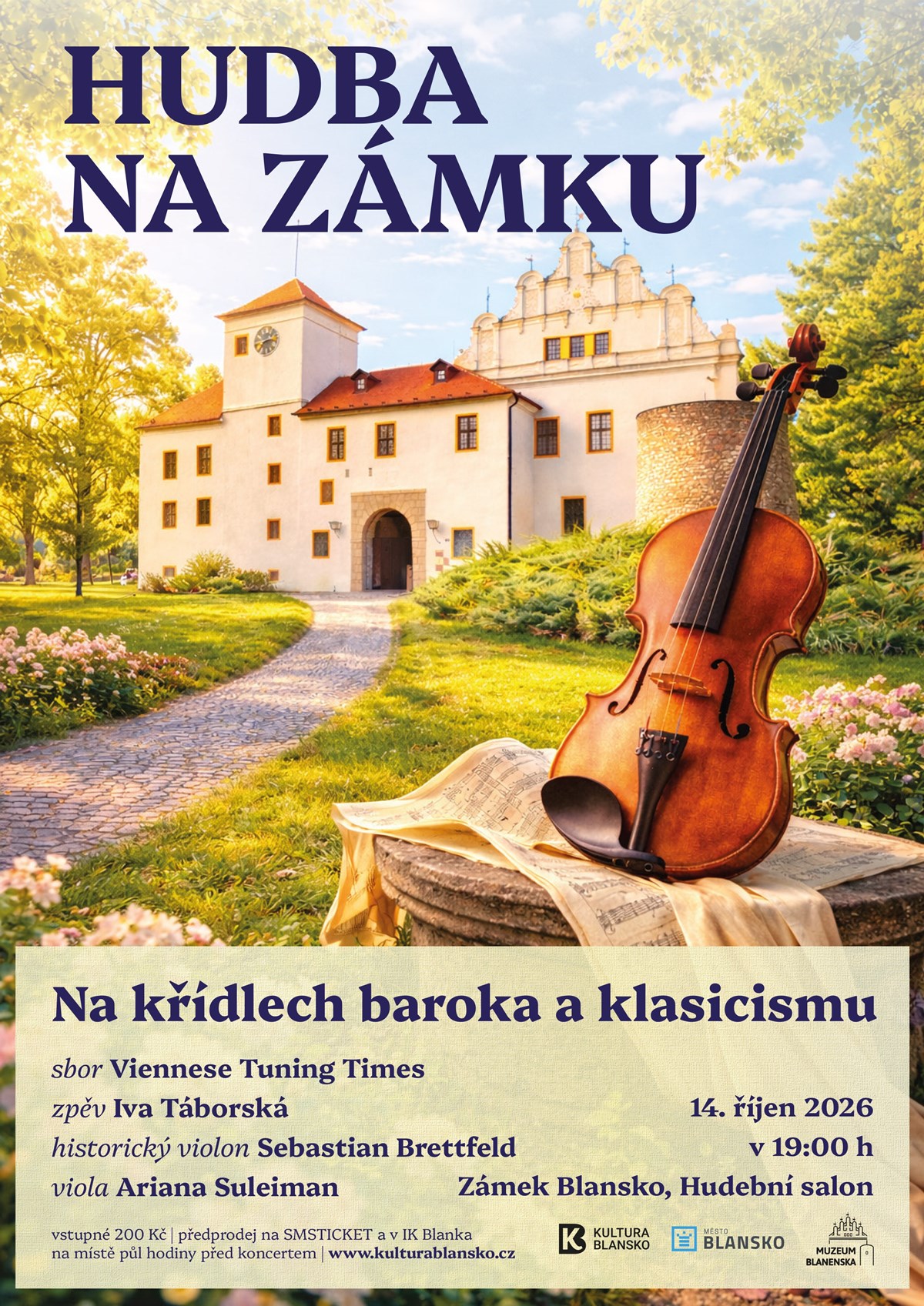 Hudba na zámku Srdečně vás zveme na výjimečný večer plný krásné hudby v kouzelném prostředí zámku Blansko. Koncert Hudba na zámku vás provede světem staré hudby – Na křídlech baroka a klasicismu. Účinkují:- Viennese Tuning Times – sbor- Iva Táborská – zpěv- Sebastian Brettfeld – historický violon- Ariana Suleiman – viola14. října 202619:00 hodinZámek Blansko, Hudební salonPřijďte si vychutnat jedinečnou atmosféru historického místa a hudbu, která oslovuje srdce i duši.