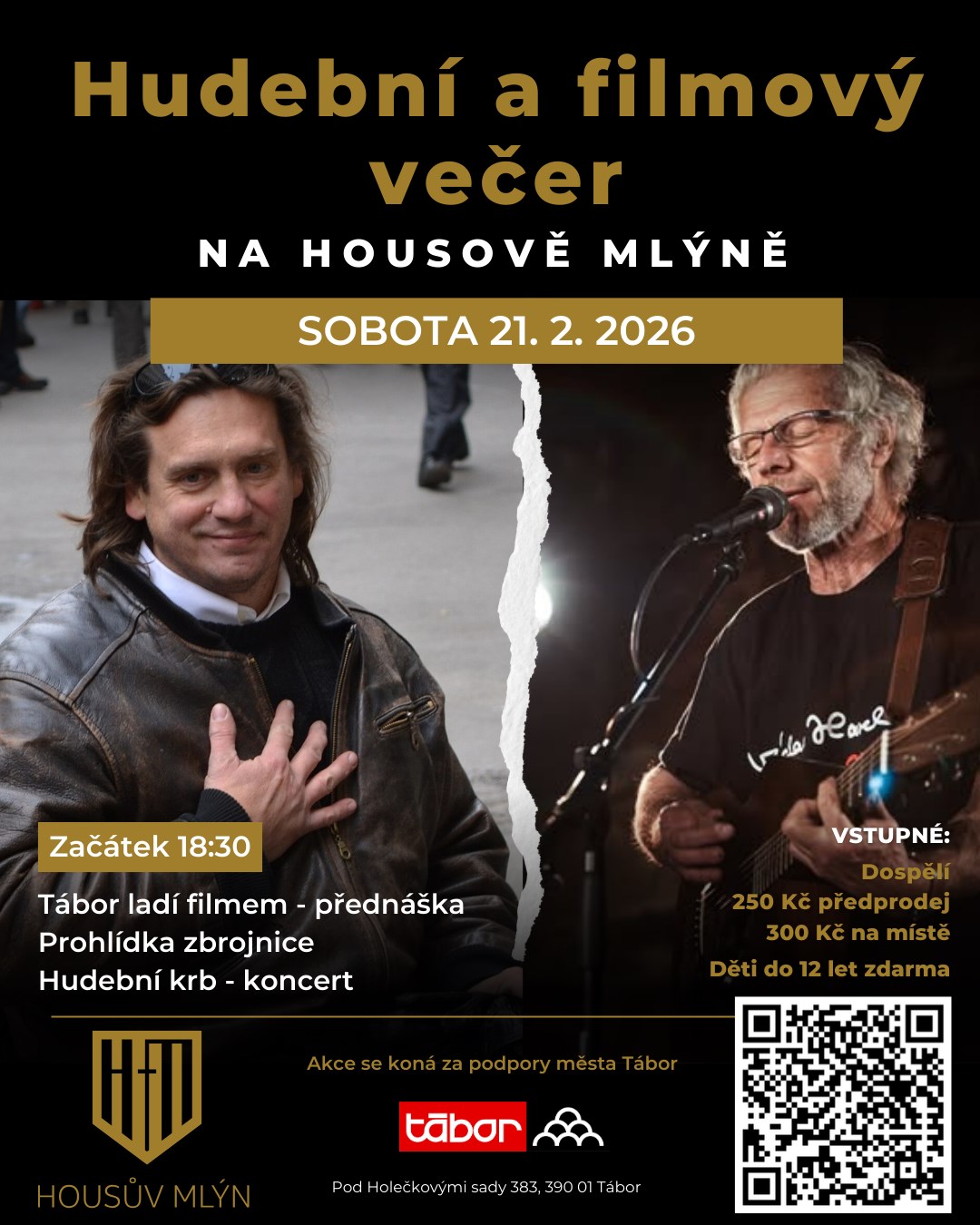 Hudební a filmový večer🎬🔥 Tábor ladí filmem & Hudební krbFilmové příběhy a hudba u ohněDatum: 21.2.2026 pátekMísto: Housův mlýn v TábořeJedinečný večer, který propojuje svět velkého filmu, autentické filmové rekvizity a živou hudbu v komorní atmosféře u krbu.Harmonogram večera18:30–19:30 | Tábor ladí filmem🎥 filmová přednáška19:45 | Prohlídka filmové zbrojnice🛡 komentovaná prohlídka20:30 | Hudební krb🔥 živé hudební vystoupení u krbuPROGRAM🎬 Tábor ladí filmemHost: Jan Potměšil – herecJan Potměšil patří mezi respektované české herce s bohatou divadelní a filmovou kariérou. Svou profesionalitou a přístupem inspiruje nejen kolegy, ale i publikum.🔹 Proč přijít?Protože uslyšíte příběhy ze zákulisí českého filmu, osobní zkušenosti z natáčení a unikátní pohled herce na filmové postavy a scénáře, které běžně veřejnost neslyší.🛡 Prohlídka filmové zbrojniceKomentovaná prohlídka unikátní filmové zbrojnice s rekvizitami a zbraněmi používanými ve filmech.Autentický prostor, skutečné předměty a příběhy, které propojují filmovou teorii s realitou natáčení.🔥 Hudební krbHost: Jirka Smrž – zpěvákJirka Smrž je charismatický český zpěvák a hudebník, který svým hlasem a energií vytváří nezapomenutelnou atmosféru. Jeho hudba kombinuje prvky folku, jazzu a moderního songwritingu.🔹 Proč přijít?Protože Hudební krb není běžný koncert.Je to intimní hudební set u ohně, prostor ke zpomalení, k poslechu a k doznění celého večera plného filmových příběhů.Jeden večer. Dvě silné části. Jeden zážitek.🎟 Jedna vstupenka zahrnuje celý program večera.🎟 V předprodeji jsou vstupenky výhodnější.🎟 Děti do 12 let mají vstup zdarma.👉 Doporučujeme koupit vstupenky včas.
