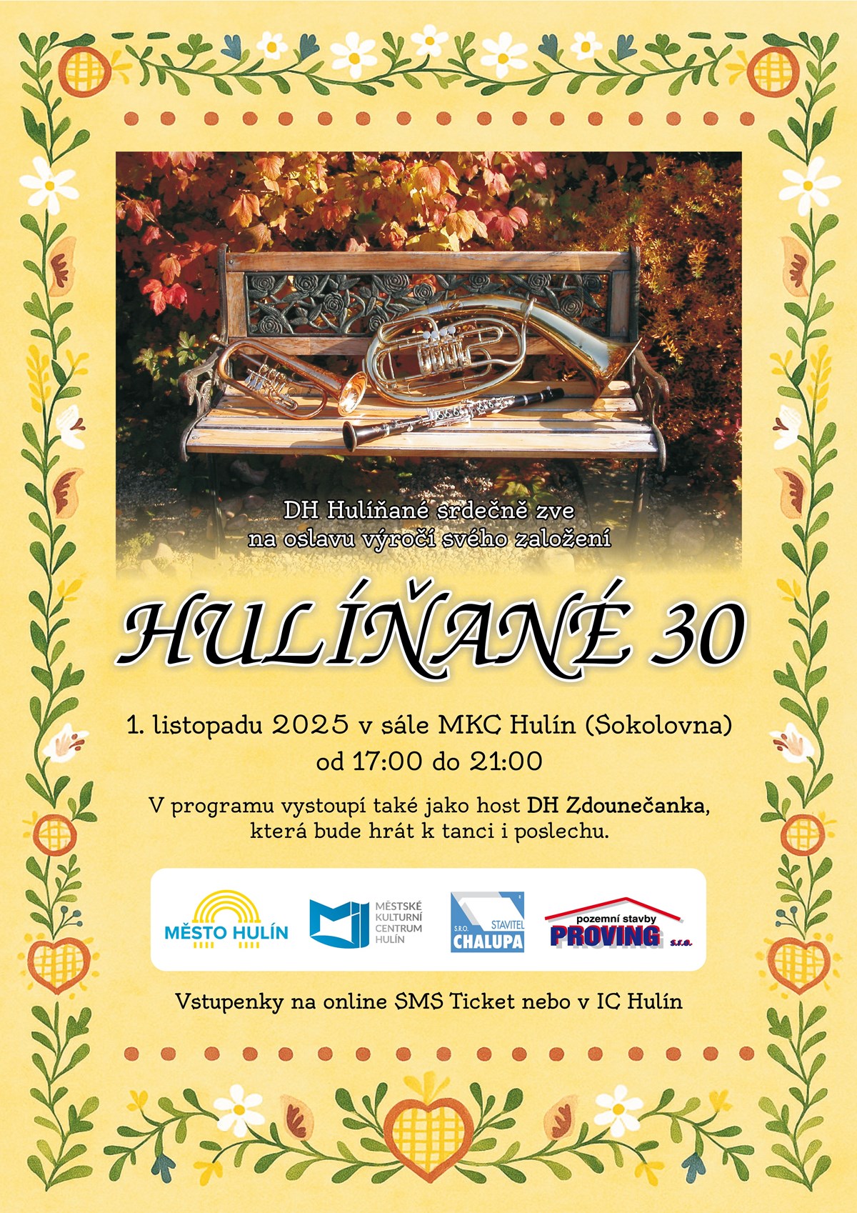 DH Hulíňané srdečně zve na oslavu výročí svého založení HULÍŇANÉ 30, která se uskuteční 1. 11. 2025 v sále MKC Hulín od 17:00 do 21:00.V programu vystoupí také jako host DH Zdouněčanka, která bude hrát k tanci i poslechu.Cena vstupenky je 350 Kč. Vstupenky online na této stránce nebo v IC Hulín.Předprodej bude zahájen 23. 9. 2025.