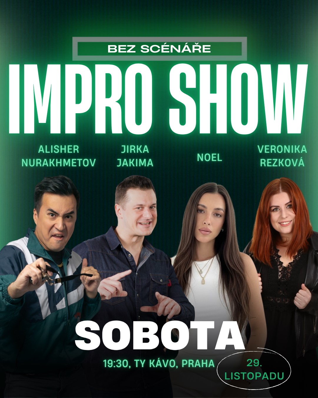 Impro Show Bez ScénářeMožná už jste improvizační komedii viděli v podobě Partičky nebo legendárního americkýho Whose Line Is It Anyway?Ale poprvé jí můžete zažít v podání týhle jedinečný čtveřice:Alisher Nurakhmetov • Noel • Jirka Jakima • Veronika RezkováDoražte v sobotu 29. listopadu do Ty kávo od 19:30 a pojďte se s námi pobavit nad chaosem, kterýmu společně vdechneme život přímo na stagyŽádný scénáře—jen čistej improvizavanej chaos plnej humoru a momentů, který vzniknou jenom jednou.Těšíme se na vás!