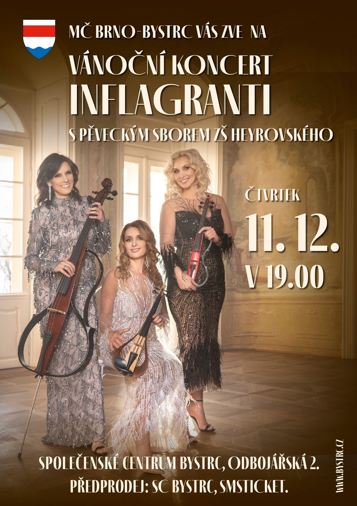 Vánoční koncert populární dámské kapely Inflagranti. Jejich repertoár je jedinečným spojením klasických melodií, moderní hudby a kouzelné vánoční atmosféry.Jako hosté vystoupí s kapelou děti z pěveckého sboru ZŠ Heyrovského.Přijďte si užít večer plný hudby, radosti a předvánoční pohody!