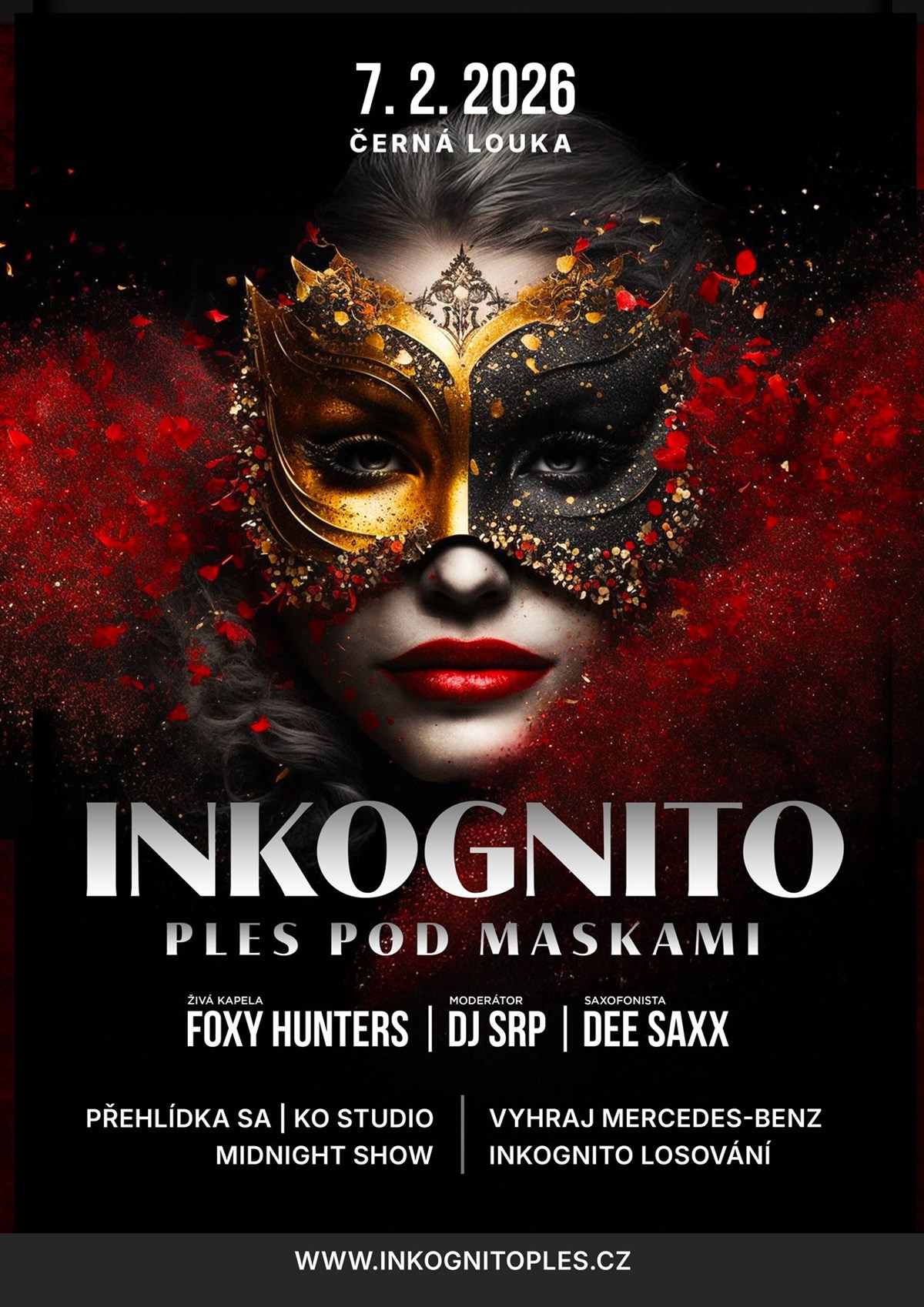 Přijďte zažít nezapomenutelný večer plný stylu a zábavy na našem Inkognito plese pod maskami. Tento ples, který se koná 7. února 2026 na Výstavišti Černá louka v Ostravě, Vás přivítá atmosférou tajemství a elegance. Ponořte se do kouzelného večera, kde hlavními hvězdami jsou nejen ŠKRABOŠKY, ale i Vy sami!Program Inkognito plesu bude bohatý, dynamický a lákavý pro všechny generace.Foxy Hunters – živá kapela, která otevře večer a postará se o skvělou atmosféru na tanečním parketu.Sako Studio – nejexkluzivnější módní zážitek večera v podání návrháře a stylisty Luďka Šmehlíka.DeeSaxx – mezinárodní eventový saxofonista, jehož energické a charismatické vystoupení dodá večeru jedinečný náboj.Půlnoční show FEMMEPLAY – nezapomenutelná show plná elegance, smyslnosti, emocí a ženské energie.Pole dance duo – Lenka Biskupová & Kateřina Jůzová – špičkové duo, které předvede silovou a zároveň elegantní akrobacii.DJ SRP – na závěr večera se postará o rytmy, díky kterým protančíte noc až do ranních hodin.Naším cílem je připravit akci, kde všichni mohou tančit a užít si společný večer plný elegance a hravého napětí.Chceme propojit věkové kategorie od 18 let a více, protože i starší generace se umí bavit! TYPY VSTUPENEKVstupenky na stáníVhodné pro studentyNa plese nejste nijak omezení – možnost pohybovat se kdekolivNáš nabitý program Vám nedovolí si odpočinout!Vstupenky na sezeníSezení u kulatého stolu pro maximálně 10 osobBlízko k baru a občerstveníSkvělý výhled na vše co se děje na parketu i pódiuVIP vstupenkyVIP odbavení vstupenky při příchoduWelcome drink3 lístky do inkognito losováníTří chodová večeře formou rautu od restaurace Horní dvůrVIP bar - konzumace není v ceně lístkuDegustace vína v ceně vstupenky od vinařství Fučík
