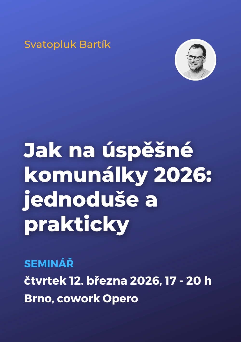 Tříhodinový osobní seminář zkušeného politického marketéra Svatopluka Bartíka:JAK NA ÚSPĚŠNÉ KOMUNÁLKY 2026: JEDNODUŠE A PRAKTICKYKdo se chystá kandidovat v roce 2026 do městského či obecního zastupitelstva, má nejvyšší čas začít promýšlet strategii, budovat síť příznivců a dostávat se do povědomí spoluobčanů. Ukážu vám, jak na to – čistě prakticky s orientací na váš co nejlepší volební výsledek.Co se naučíte:jak formulovat svoje vize a cíle do volebního programu a servírovat je spoluobčanůmjak připravit a provést úspěšnou volební kampaň jak se profilovat v místních médiíchjak začít s kampaní už teď, abyste ji nemuseli vést jen pár týdnů před volbami a získali náskokjaké nástroje pro akvizici voličů fungují a jak je pořídit co nejlevněji nebo zdarmajak sestavit dobrou kandidátkujak registrovat kandidátku nezávislých kandidátů nebo politické strany či hnutí Které problematiky proberem:základy politického marketingu - Sequelovo desaterozáklady lokálního public relationszákon o volbách do zastupitelstev obcíÚčastník kurzu obdrží zdarma skripta shrnující vše podstatné z kurzu. Navíc má každý absolvent u mne zdarma jednu hodinu konzultace zdarma, kterou lze čerpat i nadvakrát e-mailem či telefonicky, přes Skype či Zoom, případně i na osobní schůzce (naplánované po předchozí domluvě v Praze či v Brně). Tříhodinový blok je rozdělen na dva bloky s cca desetiminutovou přestávkou. V první části se věnuji spíše právním a organizačním záležitostem podání a sestavení kandidátky a vlastního programu. V druhé části se zaměřujeme už jen na samotnou kampaň, její hlavní zásady, hlouběji rozvedeme několik stručně zmíněných teorií a řešíme hlavně praktickou podobu kampaně. Kurz je vhodný pro kandidáty jak v malých obcích, tak velkých aglomerací, zmiňuji širší škálu nástrojů vhodných pro všechny typy kandidátek (stranické, nezávislé). Po škončení školení mívám většinou pár desítek minut čas ještě pokračovat diskuzí s frekventanty na otázky, které je zajímají. Hlavní účely mého školení jsou:nutné minimum právních a organizačních informacípředání klíčových principů, jak funguje voličské rozhodování dlouho i těsně před volbami – stručně teoreticky, ale vysvětleno velmi praktickyposkytnutí konkrétních rad, jak na samotnou kampaň a přímou i mediální komunikaciinspirovat, nadchnout a nastartovat účastníky školení pro vlastní kampaň a jejich správnou "bojovou" náladu :-)Abychom během webináře měli dostatek prostoru pro zodpovězení vašich dotazů, jeho kapacita je maximálně 12 účastníků. - - - PS: Sdílejte link na tento workshop všem kandidátům a kandidátkám, kterým ve volbách fandíte ✊- - - Lektor SVATOPLUK BARTÍKOd roku 2000 jsem vedl více než desítku volebních kampaní do senátu, komunálních i krajských voleb (4Koalice, Strana zelených, nezávislí kandidáti za SZ, TOP09 a KDU) a dalších veřejných kampaní (kampaň k brněnskému referendu v r. 2004) či public affairs iniciativ (např. spolek Telefonující.cz, úspěšná kampaň za regulaci hazardu, která vyvrcholila přijetím nového zákona o regulaci hazardu v roce 2016).Jako tvůrce strategií kampaní jsem v roce 2014 a poté opět v roce 2018 a 2022 úspěšně přivedl například do křesla starostky Šlapanic u Brna Michaelu Trněnou (naposledy 9 mandátů z 17 pro SNK Čisté Šlapanice) a na Slovensku v Nitře v letech 2018 a 2022 do křesla primátora Marka Hattase (2x vítězství v přímé volbě). U dalších volebních kampaní jsem poskytoval strategické poradenství, příp. koučink klíčových kandidátů.V roce 2020 jsem pracoval jako strategický poradce na kampani hnutí Starostové a nezávislí v Ústeckém kraji a pro Piráty v Jihomoravském kraji.V roce 2006 a posléze i v roce 2014 jsem také osobně úspěšně kandidoval do zastupitelstva Městské části Brno-střed. Do zvolení do funkce radního MČ Brno-střed jsem působil jako mediální poradce se specializací na strategie komunikace, krizovou komunikaci a politický marketing. Od roku 2018 se opět věnuji politickému marketingu a komunikaci a public affairs.Od roku 2001 toto školení absolvovalo již přes 600 účastníků.Profesní CV lektora: www.linkedin.com/in/svatoplukbartik.#volby#komunální_volby#kampaně#kandidatura#kandidátka#jak_volit#kroužkování#panašování#kandidátní_listina#termín_voleb#kdy_budou_komunální_volby#politický_marketing