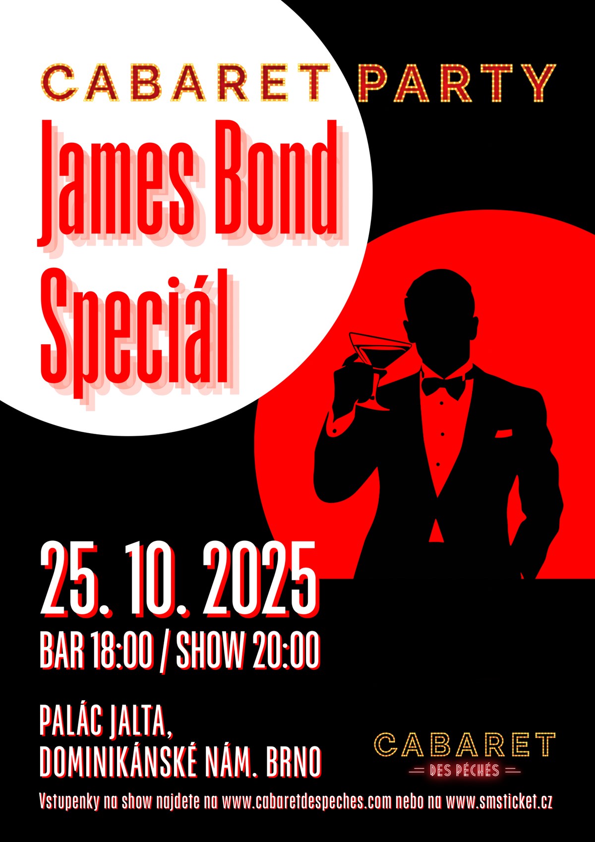 CABARET JAMES BOND NIGHTProtřepat, nemíchat.Vstupte do světa špionáže, elegance a nebezpečně dobré zábavy.Jedna noc. Jeden agent. Bezpečnostní protokol: zábava na vlastní nebezpečí.Čeká vás večer plný akce ve stylu 007 – od tematických drinků přes tajné mise až po bondovský kvíz, který prověří vaši znalost filmového vesmíru MI6. A kdo ví – možná právě vy získáte licenci na výhru v některé z našich soutěží.Oblečte smokinky a vysoké podpatky – a buďte styloví.Vaším jediným úkolem: neodhalit svou pravou identitu… a bavit se.Zahalený kabaret, svůdné písně, podmanivá atmosféra a špetka nebezpečí.Tady totiž platí jedno pravidlo:Co se stane v Cabaretu, zůstane v utajení.