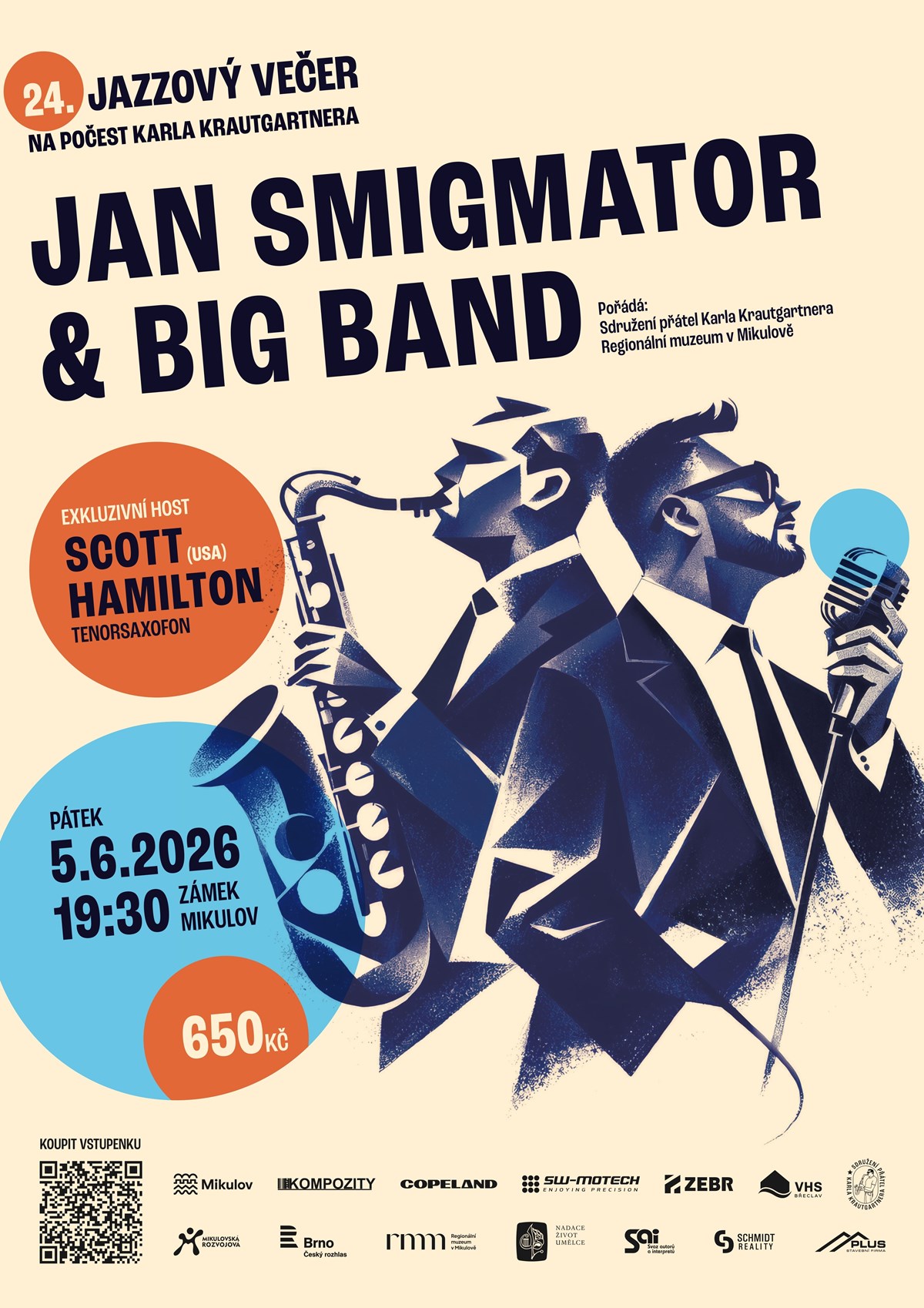 JAN SMIGMATOR & BIG BAND, exkluzivní host Scott HamiltonKoncert se koná jako 24. Jazzový večer na počest Karla KrautgartneraVečerní program se tradičně odehraje v prostorách konferenčního centra mikulovského zámku. Samotný koncert bude zahájen v 19:30 hodin. V letošním roce se nám podařilo dojednat opravdovou hudební lahůdku v podobě českého swingového zpěváka Jana Smigmatora se svým osmnáctičlenným bigbandem.Jan Smigmator je hvězdou světového významu, která pravidelně vystupuje v zahraničí, případně v doprovodu zahraničních hostů. Na domácí scéně spolupracuje s tělesy, jako Orchestr Václava Hybše, Felix Slováček Big Band, Orchestr Karla Vlacha, Bohemia Big Band, B-Side Band, Kentonmania Big Band, Big Band Českého rozhlasu, Gustav Brom Big Band, Ústřední hudba Armády České republiky nebo Josef Vejvoda Trio.V zahraničí jsou to pak Ack van Rooyen, Kim Nazarian, Jay Ashby, Bobby Shew, Peter Lipa, Jumaane Smith, Mitch Winehouse, Tom Gaebel. V roce 2023 Jan Smigmator debutoval jako sólista v Newyorské Carnegie Hall.Ochuzeno o mezinárodní rozměr nezůstane ani mikulovské publikum a na pozvání interpreta si s bigbandem zahraje jazzová legenda světového významu, tenorsaxofonista Scott Hamilton z USA, který do Mikulova přicestuje z italské Florencie, kde dlouhodobě žije. O Scottu Hamiltonovi by se dalo napsat mnoho, nicméně, když zmíníme, že byl členem orchestru legendárního Bennyho Goodmana, jsou jakékoli další řádky zbytečné.V průběhu koncertu bude tradičně udělen Řád Karla Krautgartnera, který letos obdrží Jan Smigmator.Před večerním koncertem se v 17 hodin před mikulovským rodným domem Karla Krautgartnera odehraje tradiční akt odhalování a křtu bronzové hvězdy v “chodníku slávy”, který bude hudebně doprovázet mikulovská kapela Jazz Petit Q pod vedením Milana Esterky. Letošní 24. bronzová hvězda bude věnována zcela výjimečně dvojici, a sice zakladatelům a dvěma bývalým předsedům pořádajícího Sdružení přátel Karla Krautgartnera Ladislavu Kolmačkovi a Jaroslavu Smečkovi, kteří nás nedávno navždy opustili.Rodný dům Karla Krautgartnera (Náměstní 25/26, Mikulov)16:00 - 17:45 Jazz Petit Q17:00 Odhalení bronzové hvězdy v chodníku slávyZámek Mikulov19:30 JAN SMIGMATOR & BIG BAND, exkluzivní host Scott Hamilton