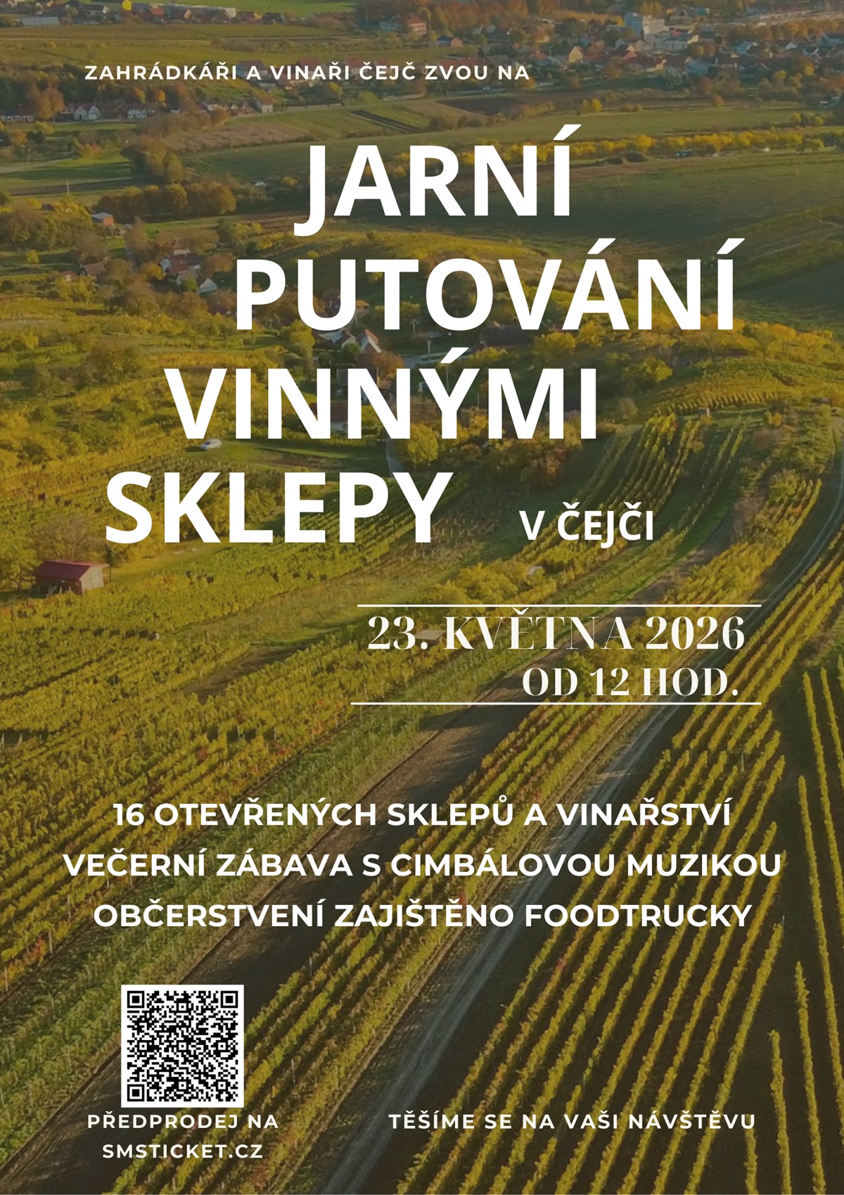 Jarní putování vinnými sklepy v Čejči 2026 Milý přátelé, spoluobčané, milovníci vína a dobré zábavy. Rádi bychom vás pozvali na akci s názvem ,,Jarní putování vinnými sklepy v Čejči", která se uskuteční 23. května 2026 od 12. hod. tradičně v areálu vinných sklepů ,,Pod Búdama".Těšit se můžete na 16 otevřených sklepů a vinařství, dobré jídlo a večerní zábavu s hudební produkcí mladá cimbálová muzika Vojtěška.Přijďte se pobavit, potkat se sousedy a kamarády se sklenkou dobrého vína. Načerpejte atmosféru Moravy, kde jinde než ve vinných sklepechOchutnáte vína od místních vinařů ze Slovácké podoblasti z Čejče. Možnost stanování zdarma přímo v areálu.Ve vstupném je obsaženo:•plánek areálu se seznamem vinařů a vzorků•degustační sklenička•propiska s taštičkou na krk•oprávnění volné degustace v označených sklepech•vstup na Besedu u cimbálu a večerní zábavuVstupné v předprodeji 500 ,- Kč, na místě 600,- KčTěší se, Zahrádkáři a vinaři Čejč