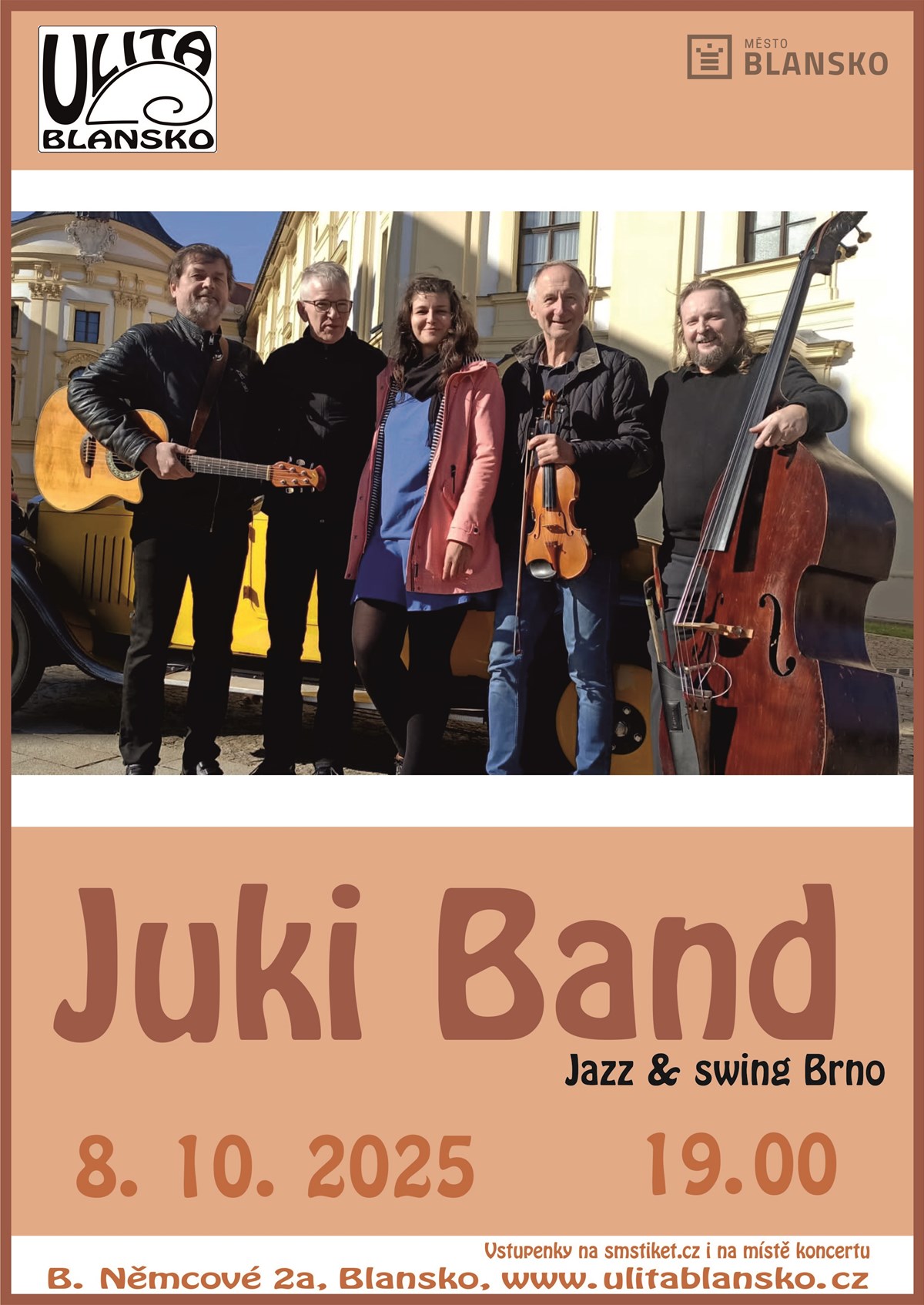 Hudební sdružení JuKi Band hraje k tanci a k poslechu ragtimové, jazzové a swingové standardy ve vlastních úpravách z období od zrodu populární hudby až po jazz šedesátých a sedmdesátých let.Nebojíme se však výletů do žánrově odlišných vod, takže můžete od nás slyšet skladby rock and rollového charakteru, country i latinu.Naše sdružení hraje aktuálně ve složení:housle (Jiří Kinzel alias Juki)kytara (Mirek Hulán)kontrabas (František Thomas alias Fred) piano (David McClurkin)bicí (Ivan Zemánek)zpěv (Veronika Beličková) Večer v Ulitě bude hostovat brněnská swingová legenda Jarda Zvoník
