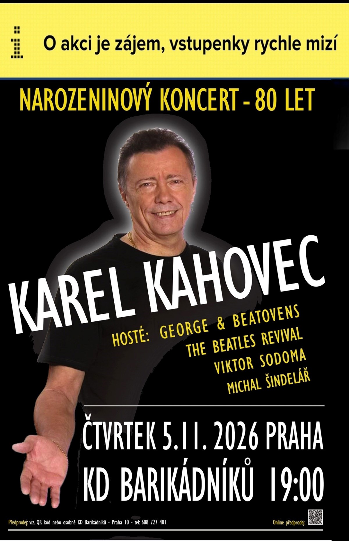 Narozeninový koncert legendárního Karla Kahovce 2026! ve čtvrtek 5.11.2026 od 19:00 Praha - KD Barikádníků ( legendární Barča)NEČÍSLOVANÉ SEZENÍ, STÁNÍ, TANECZveme vás na výjimečný hudební večer, kde své životní jubileum oslaví nezaměnitelný Karel Kahovec – ikona českého bigbítu a jeden z nejvýraznějších hlasů své generace.Na jednom pódiu se představí společně se skupinami George & Beatovens a The Beatles Revival, která koncert obohatí o nesmrtelné hity slavných „Brouků“.Můžete se těšit na největší Kahovcovy písně, mezi nimi například:Háj ModřínůPaní v černémSvou lásku jsem rozdalPoprava blond holkyA samozřejmě nebudou chybět legendární skladby The Beatles, které dodají večeru jedinečnou atmosféru.Jako vzácní hosté koncertu se představí bývalý bubeník legendárního Katapultu - Michal Šindelář s fláky od Katapultu a svým jedinečným hitem Hořely Padaly Hvězdy a legendární Viktor Sodoma se svými hitySoučástí koncertu bude také vzpomínka na Petra Nováka, jednoho z největších hlasů české hudby. Připomeneme si jeho nezapomenutelné hity:PovídejHvězdičko blýskaváJá budu chodit po špičkáchNáhrobní kámenPřijďte zažít večer plný emocí, velkých hitů a judebních legend.Tahle narozeninová oslava bude stát za to! V případě eventální smrti Karla Kahovce (např. předávkování Viagrou) se koncert koná jako vzpomínka na Karla Kahovce.