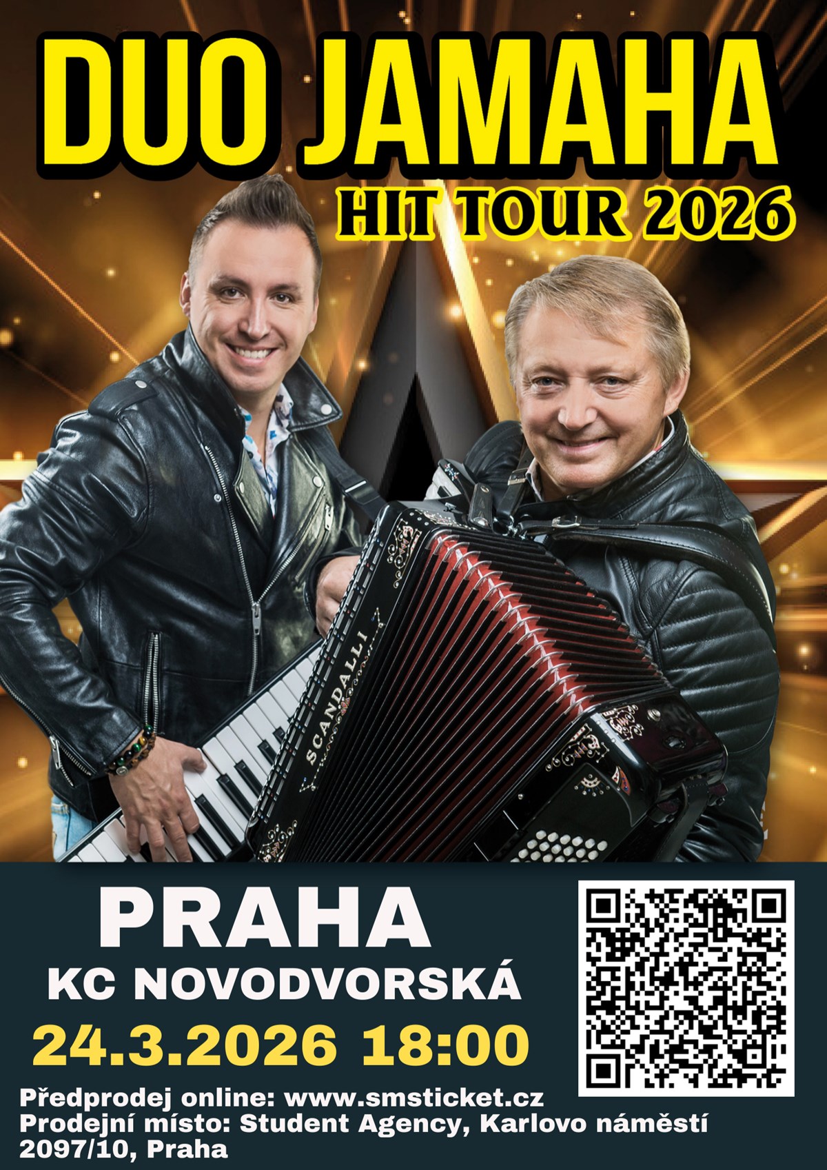 Zveme Vás na hudebně-zábavný program pro všechny generace!Hudební skupina DUO JAMAHA přichází s HIT Tour – koncert složený z největších hitů hudební skupiny namíchaný s humorným slovem a to i záhoráckým Stand-Up vystoupením, o které se postará právě jeden z členů hudební skupiny.Skupina je známá hlavně z televizních obrazovek a rádií. Získala za prodej nosiče zlaté a platinové desky, Oscara Smago Awards, a jiná ocenění... přichází Vás opět zabavit a připravili si nezapomenutelný zážitek plný hudby a humoru. Přijďte si zazpívat, odreagovat se a načerpat tu správnou energii. Na koncertě zazní rytmické melodické písně, starší a novější hity!Tisíce lidí a fanoušků vidělo poslední turné po České a Slovenské republice.Těšíme se opět na Vás! Bude to skvělá jízda!Cena vstupenky 350,-Kč a v den konání akce na místě 390,-Kč.Začátek koncertu: 18:00 hodin.