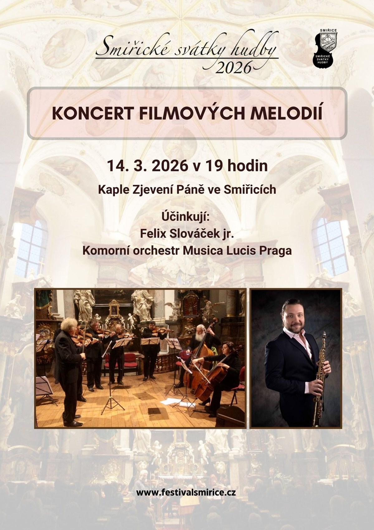 Zahajovací koncert 23. ročníku festivalu nás opět provede světem filmových melodií. Program je věnován české filmové scéně a skladatelům P. Hapkovi, K. Svobodovi a dalším.Účinkují: Komorní orchestr Musica Lucis Praga a Felix Slováček jr.