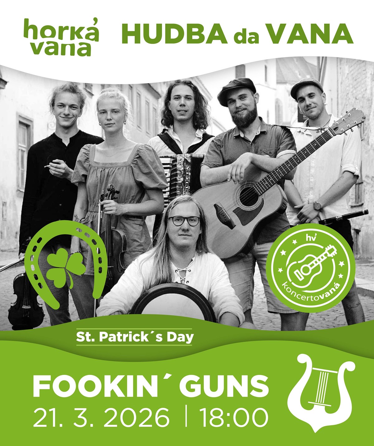 FOOKIN´ GUNS – ST. PATRICK´S DAY V HORKÉ VANĚPŘIJEDOU ZAS! - protože Horká vana je miluje a sluší jim.A tentokrát přímo pod zelenou vlajkou svatého Patrika a čeká váš opět několikahodinovej irskej nářez!Fookin’ Guns – mladá parta, co míchá irskej folk, poctivej rockovej tah a hospodskou energii, která se nedá prosedět. Housle, akordeon, kytary, zpěvy. Hudba, co má kořeny v pubu a chytne za srdce.Žádný decentní podkres.Tohle je večer, kdy se zpívá nahlas.Kdy se tleská do rytmu.Kdy se pivo nestíhá ohřívat.Refrény, co chytne celej sál.Tempo, co rozhýbe i zapřisáhlýho „já jen poslouchám“.A moment, kdy si řekneš:„JO. TOHLE JE ŽIVOT.“🍀 Dress code: zelená vítána. Předprodej: 200 KčNa místě: 290 KčMinule bylo BEZNADĚJNĚ VYPRODÁNO tak neváhej!Jediný způsob jak si rezervovat místo, je zakoupení vstupenky v předprodeji.Počet míst je vzhledem k velikosti klubu omezen.Na místě pouze neprodaná kapacita vstupenek z předprodeje.