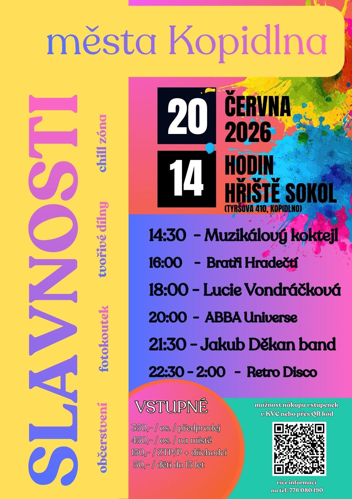 Slavnosti města Kopidlna 2026Hudební akce s vystoupením kapel a zpěváků různých žánrů, např. Muzikálový koktejl, Bratři Hradečtí, Lucie Vondráčková, ABBA Universe, Jakub Děkan band a Retro Disco.Na akci bude zajištěno občerstvení, těšit se můžete na chill zónu a fotokoutek. Myslíme i na ty nejmenší, pro které bude připraven herní a tvořivý koutek.