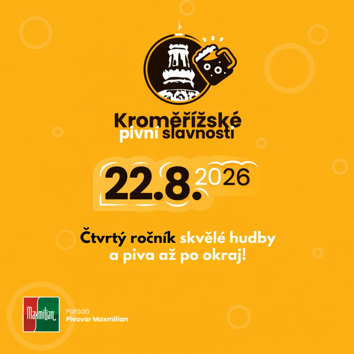 Čtvrtý ročník skvělé hudby, vyborného piva a perfektní zábavy v Pivovaru Maxmilian!Zapište si datum 22. 8. 2026!Vstup od 14:00!Čekají na Vás skvělé kapely, výborné jídlo z gastro zóny a vynikající pivo!