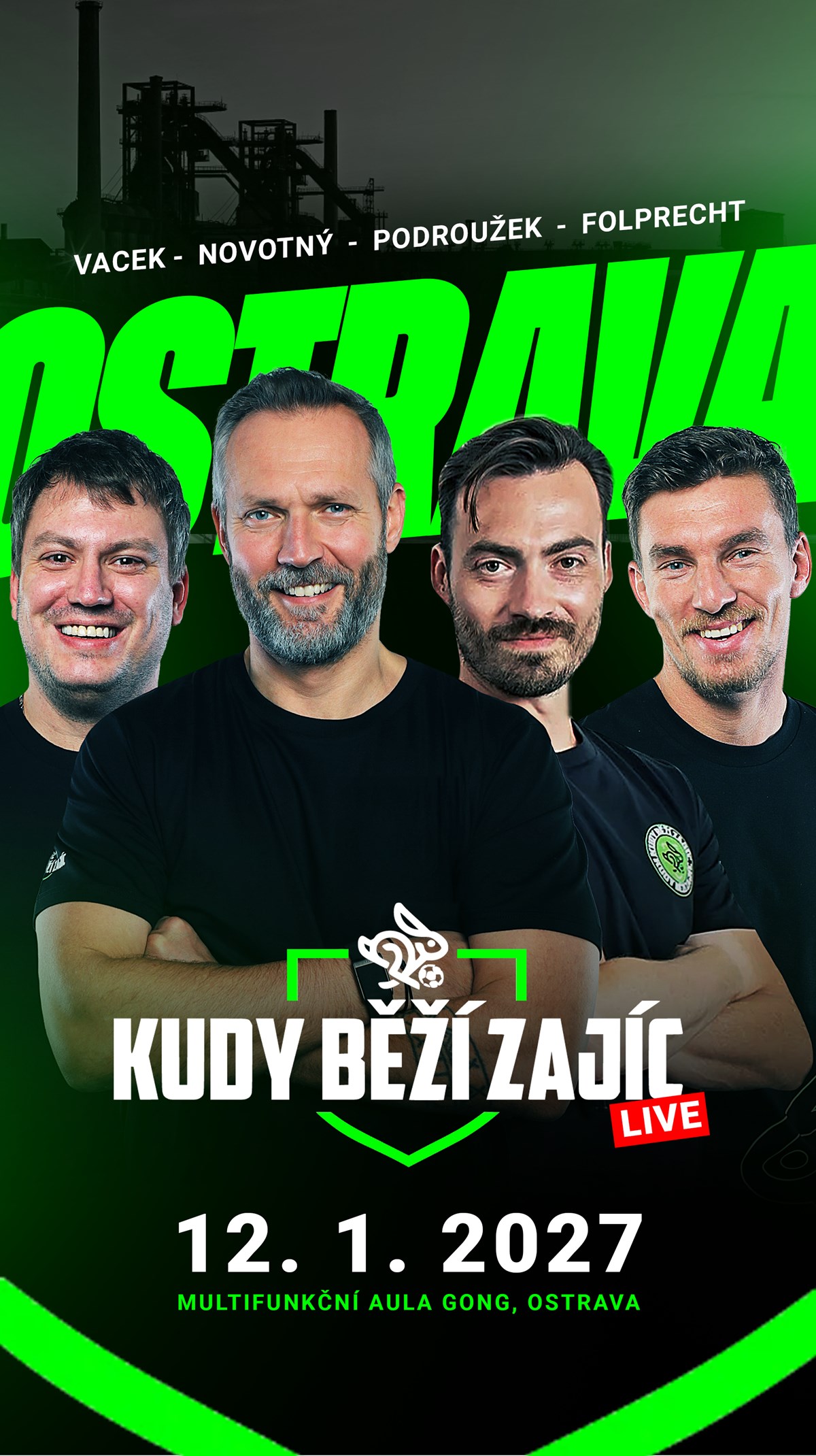 KUDY BĚŽÍ ZAJÍC LIVE – OstravaKonečně se podařilo přesvědčit Vacína, že svět nekončí u sámošky na konci karlínské ulice a vyrazí společně s celým týmem na exkurzi do toho nejdrsnějšího města v Čechách.Na paškál si vezmeme nejen Baník, ale i sestupující týmy a výherce ligy, zhodnotíme celý ročník a samozřejmě nezůstaneme nic dlužni ani reprezentaci a nadcházejícímu MS.Chceš vidět kluky naživo, pobavit se jejich historkami a zažít večer, který má větší šťávu než sobotní zápas na umělce? Ondru v roli ďáblova advokáta, Vacína mimo jeho domovský Karlín, Folpiho pokusy o absolutní freestyle dominanci nebo Podryho filozofické úvahy o stavu fotbalu – tentokrát bez nutnosti stát přímo na trávníku druholigového stadionu?Tak doraz na KUDY BĚŽÍ ZAJÍC LIVE v Ostravě. Čeká tě večer plný fotbalu, smíchu a dobré nálady v duchu Zajíce. 🍺🎤