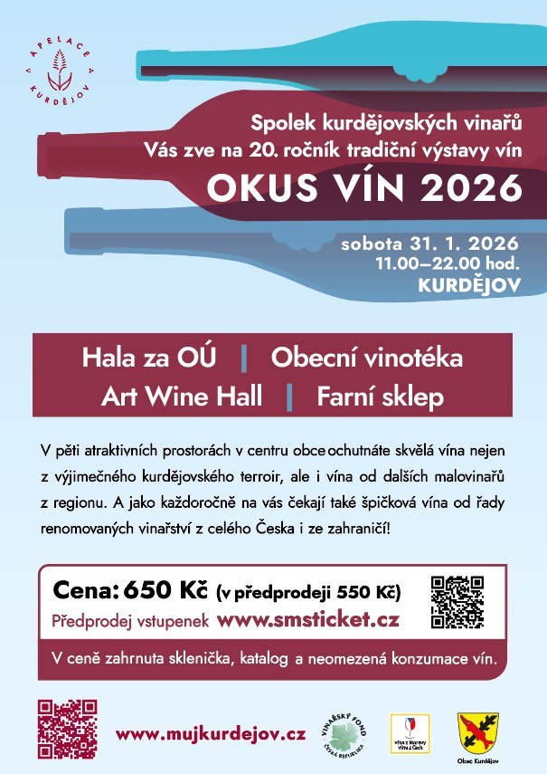20. ročník Kurdějovského Okusu Vín 2026. Srdečně vás zveme na tradiční Kurdějovský Okus Vín, který se bude konat v sobotu 31.01.2025 od 11:00 hod. Přijďte si ochutnat ty nejlepší vína spolku Vinaři Apelace Kurdějov.