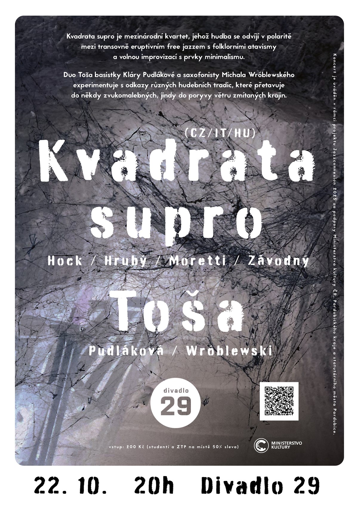 Kvadrata supro je mezinárodní kvartet, jehož hudba se odvíjí v polaritě mezi transovně eruptivním freejazzem s folklorními atavismy a volnou improvizací s prvky minimalismu. Duo Toša basistky Kláry Pudlákové a saxofonisty Michala Wróblewského experimentuje s odkazy různých hudebních tradic, které přetavuje do někdy zvukomalebných, jindy do poryvy větru zmítaných krajin.Michal Wróblewski a Klára Pudláková v rámci nového společného projektu Toša prezentují vlastní skladby v kombinaci s nespoutanou a nepředvídatelnou improvizací. Hudba dua se rozprostírá od dojímavých a přímočaře melodických písní přes zvukomalebné krajiny až po divoká rytmická běsnění. Oba hudebníci společně zkoumají možnosti spojení saxofonu a kontrabasu a experimentují s odkazy různých hudebních tradic a jejich kombinacemi. Klára Pudláková je etablovaná česká basistka a skladatelka, která vede či spoluvede tělesa Maomah, Pudlax, Avokaduo, Uthando a duo s dánskou vibrafonistkou Viktorii Sondergaard. Pro všechna zmíněná tělesa také komponuje. Kromě toho spolupracuje s různými umělci v rámci širokého žánroveho rozpětí od jazzu přes soudobovou hudbu až po interdisciplinární taneční či divadelní vystoupení. Michal Wróblewski je český skladatel a saxofonista s polskými kořeny, který spoluvede tělesa E Converso, JWQ a Karm, komponuje komorní hudbu pro různé interprety a ansámbly a spolupracuje s improvizatory z celého světa.Klára Pudláková – kontrabas / Michal Wróblewski – altsaxofon