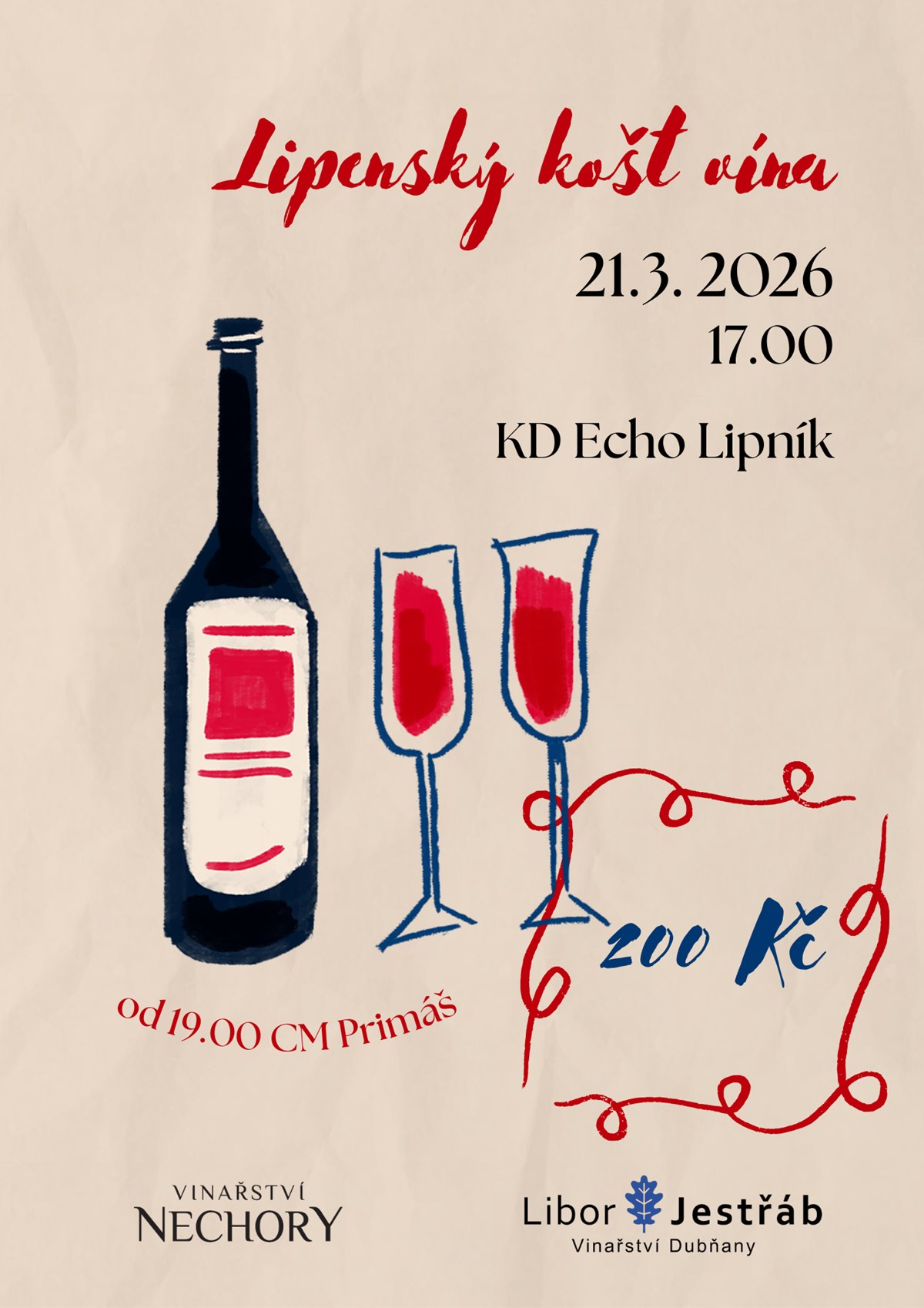 Tradiční koštování vína v Echu je opět tady! Již podruhé k nám zamíří Libor Jestřáb, který jednak přiveze vína ze svého vlastního vinařství v Dubňanech, ale také ze sklepů z vinařství Nechory. A na co se můžete těšit?* odrůdová vína z mutěnické vinařské oblasti s odborným výkladem* něco dobrého na zub k vínu* cimbálová muzika Primáš k tanci a poslechuVstupné 200 Kč. Vstupenky zakoupíte v síti smsticket.cz nebo osobně na našich prodejních místech v TIC kanceláři SVČ.Vrátná záloha na sklo je 100 Kč. Koštování vína není v ceně vstupenky.