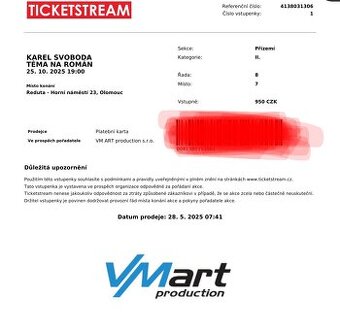 Prodám lístek na koncert Karel Svoboda, Téma na román v Olomouci konaný dne 25.10.2025 v 19. hodin v sálu Moravské filharmonie. Řada 8, místo č. 7. Původní cena 950,-. Bohužel se nemohu zúčastnit.