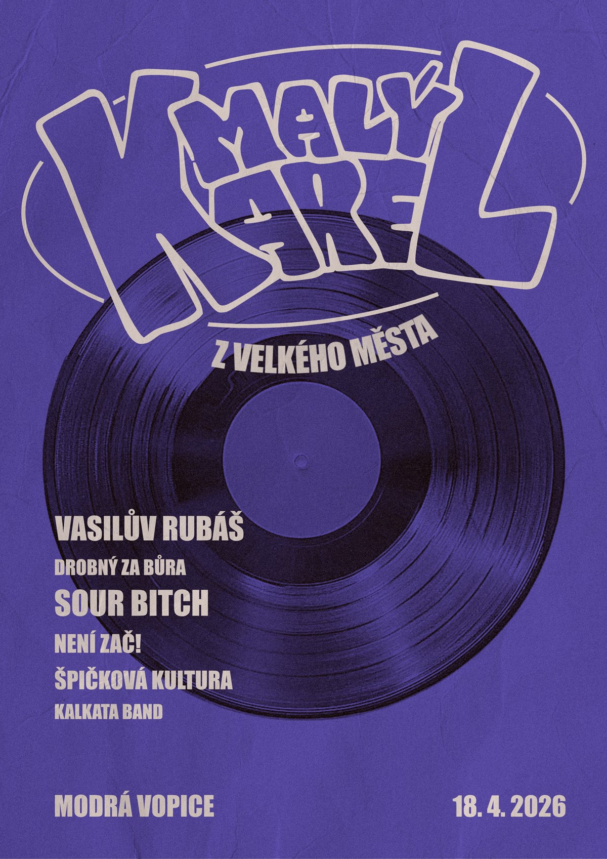 Festivalový svéráz KAREL se po roce vrací do Prahy. Konkrétně Malý Karel z velkého města — klubová podoba letního festivalu KAREL.Přišlo vám to loni šílené? Nám taky — a právě proto v tom hodláme pokračovat!Čeká vás pestrý výběr kapel české (a pardubické zvlášť) hudební scény, okořeněný správnou dávkou punkového ducha a studentské energie. Jeden večer, spousta hudby a atmosféra, kvůli které má smysl se sejít znovu.Potvrzená uskupení:Vasilův Rubáš / Sour Bitch / Špičková kultura / Není zač! / Drobný za bůra / Kalkata band... a další jména přibudouPředprodej už od 290 Kč Sobota 18. dubna📍 Modrá Vopice, Praha