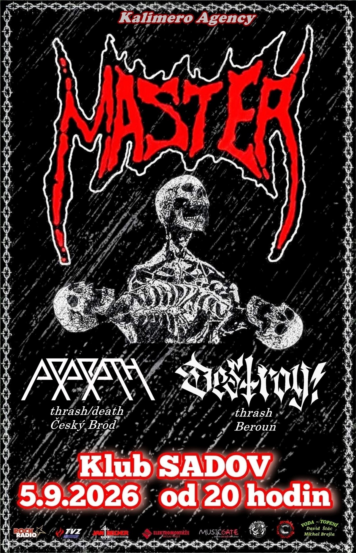 NAROZENINOVÝ MASAKR XIIJako každé září, tak i to letošní budu mít narozeniny, což většina rockerů už tuší a očekává.Hvězdou letošního večera budou přátelé legendární smečky MASTER. Tato kapela je považována za vůbec první death metalovou partu na světě. Již v roce 1983 ji založil baskytarista a zpěvák Paul Speckmann.Role hostů se zhostí mladí,ale za to pořadně tvrdé smečky a to:DESTROY - jedna z vůbec věkově nejmladších kapel u nás, která přijede z Berouna a jejich trash metalovou masírku už jste v našich končinách mohli vidět a slyšet. Kluci trochu pozměnili sestavu a to se z toho po....te.APARATH - tak tato českobrodská trash/death metalová smršť přijede vůbec poprvé a to také v nové sestavě, takže se těště.