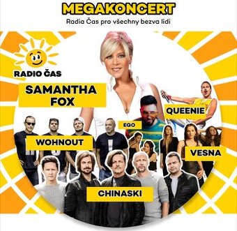 Tribuna B2 Řada 22 Sedadlo 22/23 MEGAKONCERT Radia Čas Ostravar Aréna Zobrazit na mapě calendar 22. 11. 2025 Vystoupí: Samantha Fox, Chinaski, Queenie, Wohnout a Vesna, Ego Cena za oba 1000kč