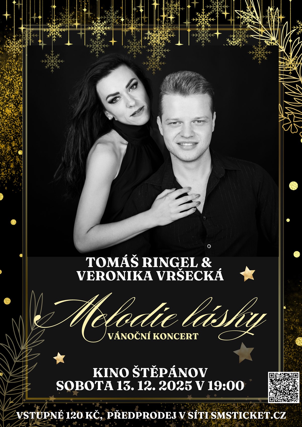 Zveme vás na svátečně laděný Vánoční koncert, na kterém vystoupí zpěváci Tomáš Ringel a Veronika Vršecká. Oba mladí umělci patří mezi výrazné tváře současné hudební scény a jejich společné vystoupení slibuje nevšední zážitek plný energie, emocí a krásných melodií.Tomáš Ringel se do povědomí veřejnosti dostal účastí v soutěži Talentmania a od té doby pravidelně vystupuje v muzikálech i na koncertech doma i v zahraničí. Spolupracoval mimo jiné s Evou Pilarovou a představil se v řadě muzikálových rolí, například v Les Misérables či v hudebním divadle Karlín.Veronika Vršecká se hudbě věnuje od dětství, vystudovala Pražskou konzervatoř a již během studií reprezentovala Českou republiku na významných akcích, například na světové výstavě EXPO. Úspěšně se prosadila v operním i muzikálovém prostředí – účinkovala v představeních pražských divadel, včetně Národního divadla, Divadla Josefa Kajetána Tyla či Hudebního divadla Karlín. Ztvárnila role v muzikálech Andílci nebo Les Misérables.Na koncertě v našem kině zazní známé vánoční melodie i slavné muzikálové písně. Přijďte se naladit na kouzelnou atmosféru blížících se svátků!