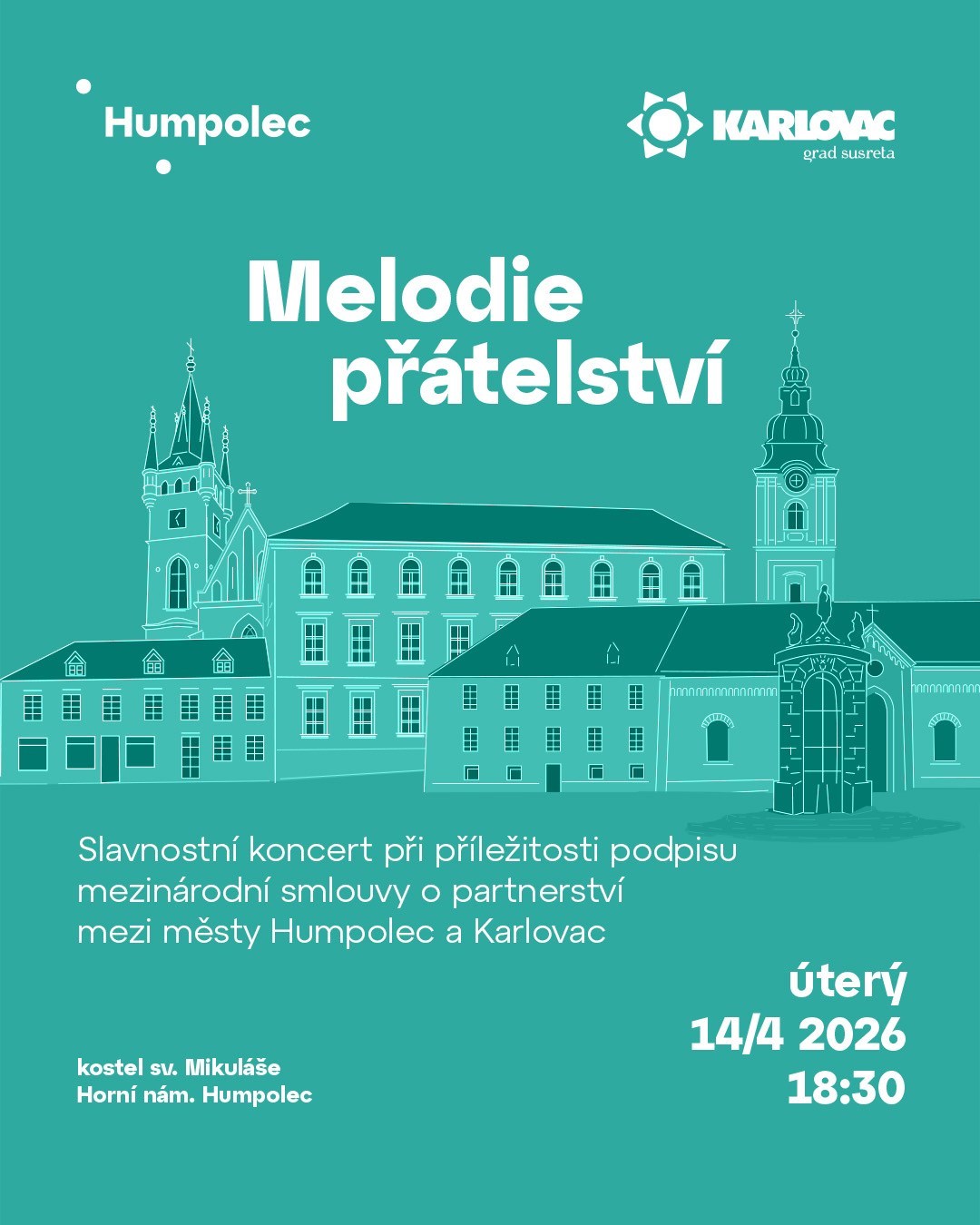 Zveme vás na slavnostní koncert při příležitosti podpisu mezinárodní smlouvy o partnerství mezi městy Humpolec a Karlovac. Účinkují žáci ZUŠ G. Mahlera HumpolecKateřina Honzlová – příčná flétnaMatěj Kůžel – akordeonžesťový kvartetMichaela Krejčí a Lucie Kůželová – klavírní doprovod Missa Brevis Jiřího PavliciDirigent: Petr ŽákSólisté: Miroslava Časarová a Bohdan PetrovićSpojené pěvecké sbory Čech a Lech, Tucet, Musica Siloensis a SlavíkKomorní orchestr Collegium Musicum Vysočina Akce se koná pod záštitou Velvyslanectví České republiky v Záhřebu a Velvyslanectví Chorvatské republiky v České republice. Akce se koná za podpory města Humpolec.