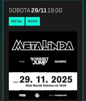 Prodám 2 vstupenky na koncert METALINDA,FOREST JUMP bude v Ostravě v Klubu Barrak v sobotu 29.11.2025 od 19 hod.Puvodni cena byla za 2 vstupenky 1180kc.Nyni nechám za 900 Kč za 2 vstupenky .Předani po domluvě před koncertem na místě