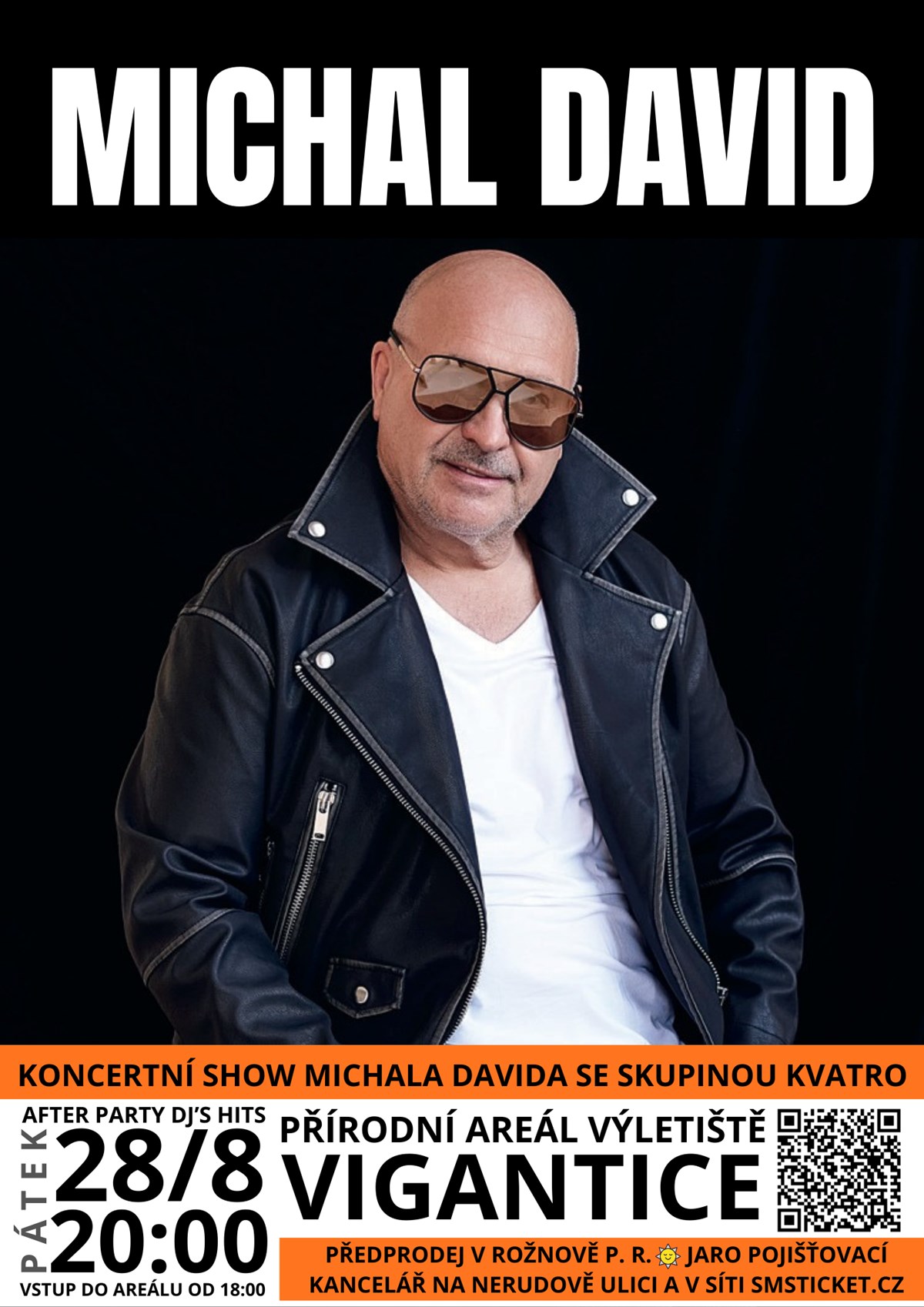 MICHAL DAVID – VIGANTICE Po 15 letech se do Vigantic vrací legenda české popové scény!Michal David vystoupí s kapelou Kvatro a zazní největší hity, které zná úplně každý. Po koncertě pokračujeme AFTER PARTY – DJ HITSZačátek koncertu: 20:00 Otevření areálu: 18:00 Vstupné – předprodej:• 1. vlna: 690 Kč• 2. vlna: 790 Kč Předprodej:• v síti smsticket• JARO pojišťovací kancelář, Nerudova ulice, Rožnov pod Radhoštěm Nenech si ujít výjimečný večer plný hitů, nostalgie a skvělé atmosféry!