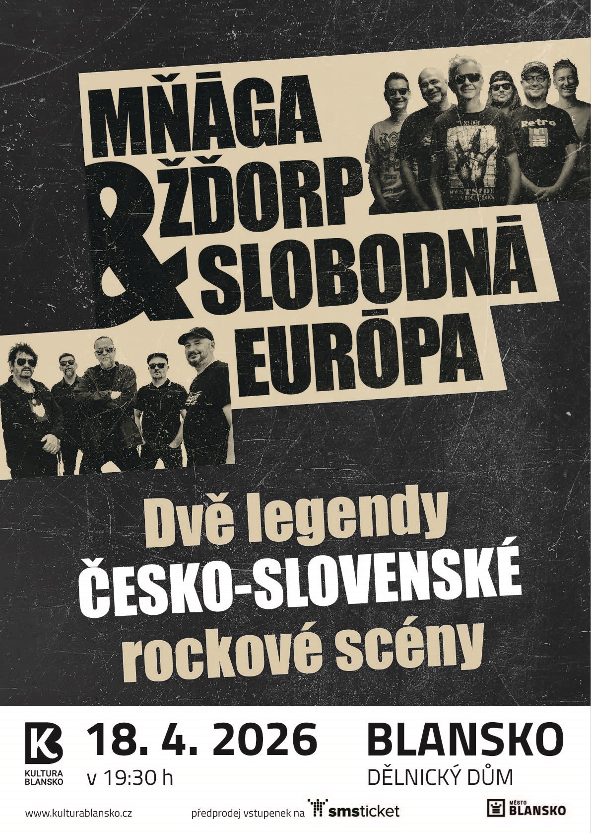 Mňága a Žďorp & Slobodná Európa v BlanskuDo Blanska míří dvě legendy česko-slovenské rockové scény!Na jednom pódiu se setkají slovenská punk-rocková kapela Slobodná Európa a česká alternativní skupina Mňága a Žďorp. Těšit se můžete na večer plný energie, chytlavých melodií, výrazných textů a poctivého rock’n’rollu.Přijďte si užít jedinečné hudební setkání, které nabídne to nejlepší z obou kapel – syrovou punkovou sílu i melodickou poetiku českého alternativního rocku.