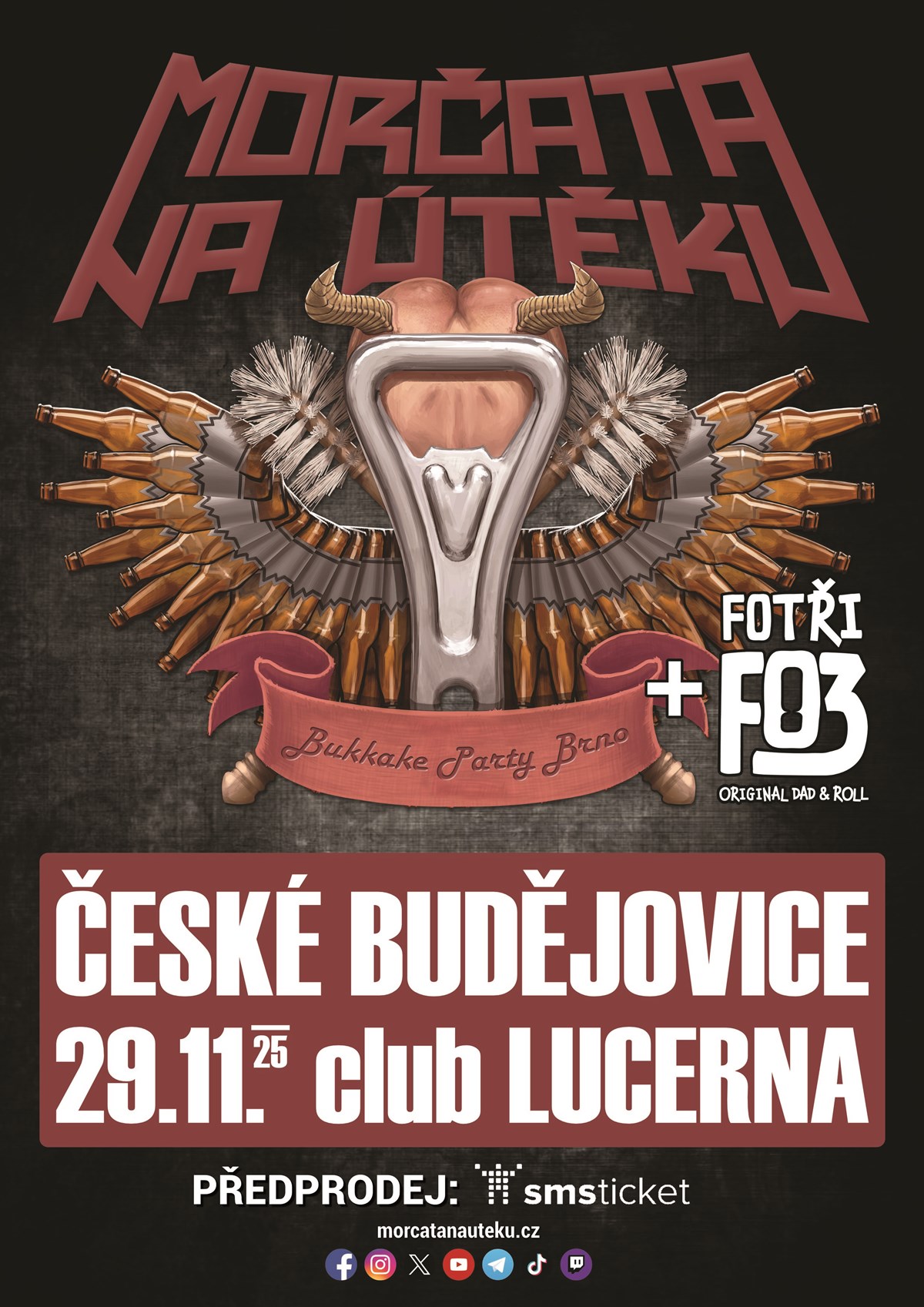 Prazvláštní kapela brněnských humoristů Morčata na útěku přijedou se svoji show do budějovické Lucerny. Spolu s nimi vystoupí neméně vtipná domácí banda rockerů Fo3 (Fotři).