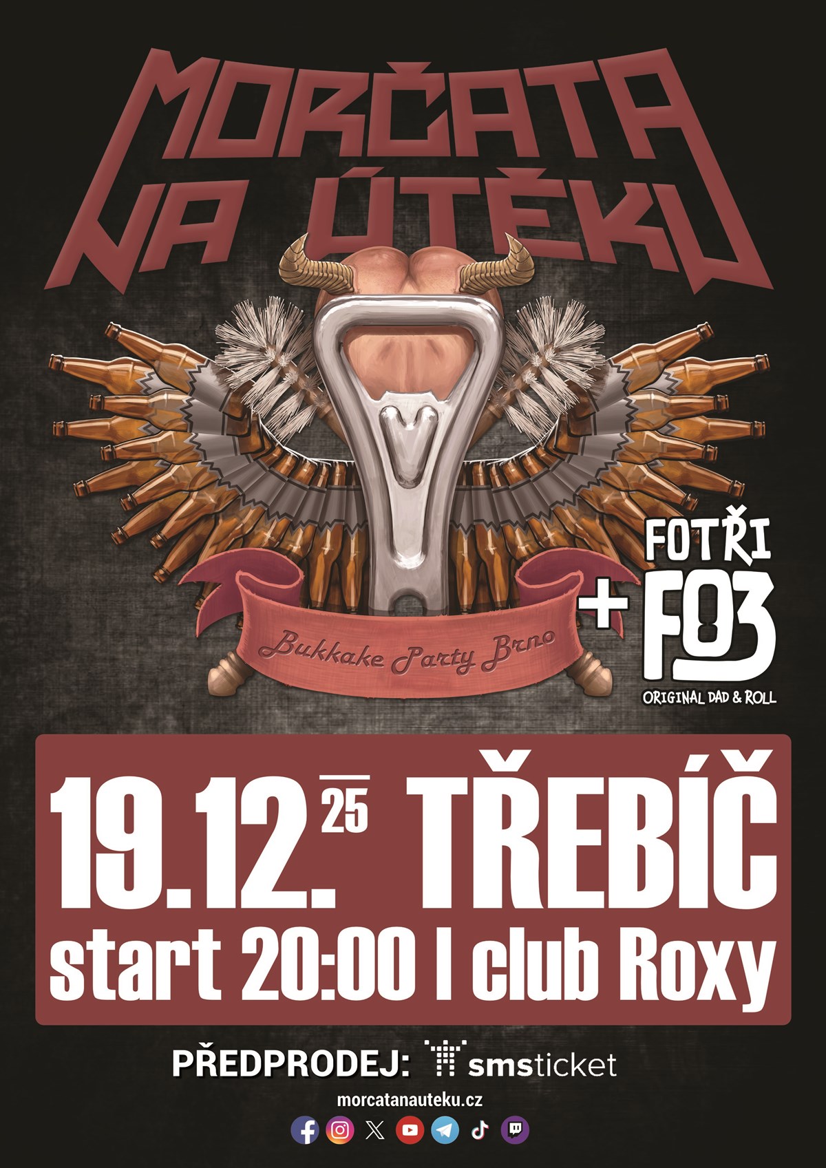Tradiční vánoční setkání s Morčaty na útěku v třebíčském klubu Roxy. Tentokrát s sebou přivezou budějovickou kapelu Fo3 (Fotři), kteří kloubí otcovství rock'n'rollem...