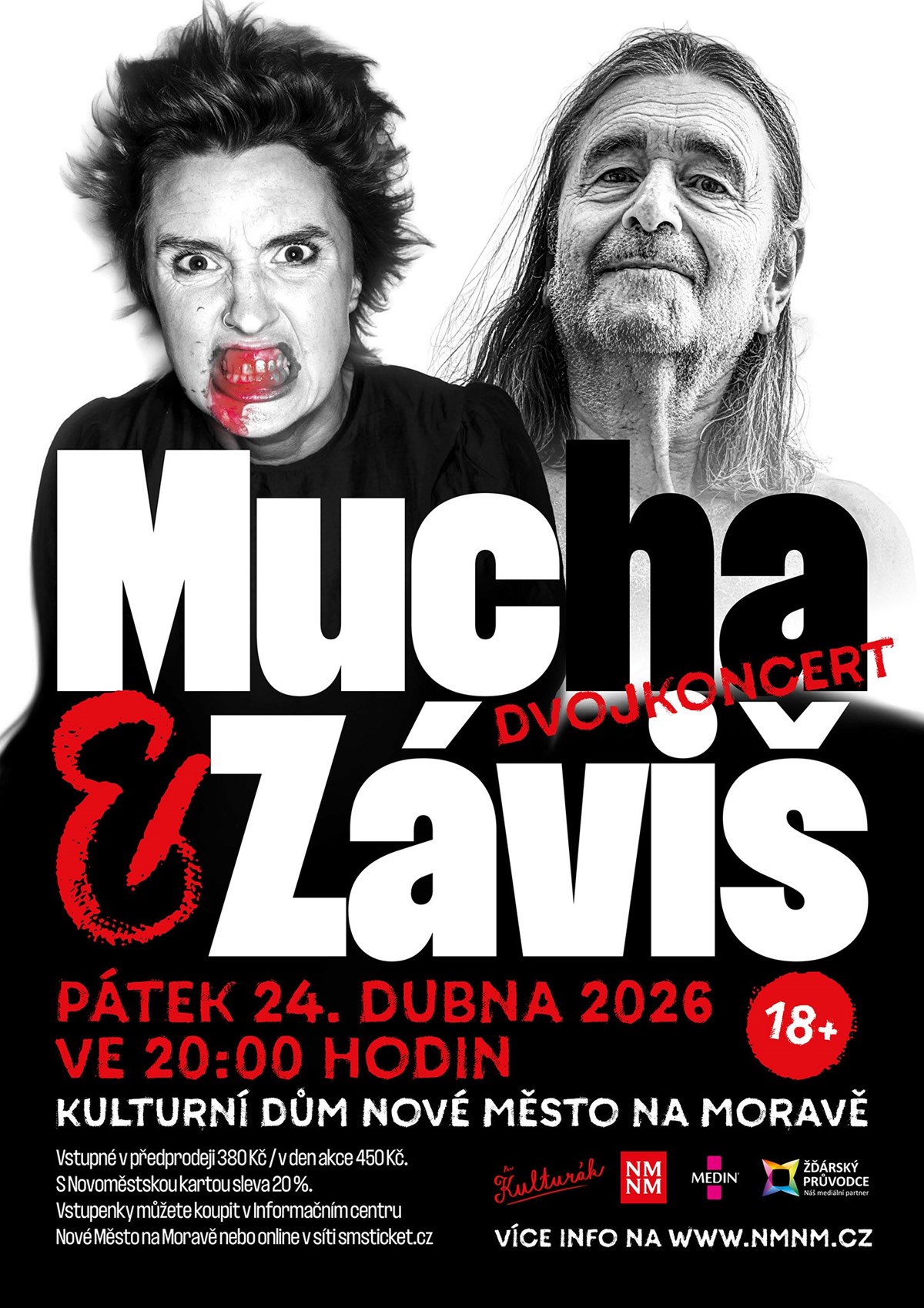Záviš a Mucha, nejsjetější dvojice v Novém Městě na Moravě.Přívítej jaro písní a tancem !Ano, slyšíte správně. Mucha je zpět! Po šesti letech vydává Nikola Mucha se svou partou nezastavitelných muzikantů nové album – syrové, zběsilé, plné životního chaosu a něžné upřímnosti. Texty balancují mezi ironickým komentářem společnosti, vzpomínkami na dospívání v Kyjově a reflexí mezilidských vztahů. A všechno to táhne ADHD energie, která by mohla rozjet i mrtvé divadlo.K tomu se přidává Záviš – legendární písničkář, kterého znají všichni, kdo mají rádi humor a nadsázku. Záviš Kníže pornofolku, básník a zpěvák, který svou tvorbu s autobiografickými prvky představoval už za minulého režimu v hospodě u Vranovské přehrady. Jeho koncerty baví publikum napříč generacemi – takže připravte uši, mysl i možná trochu studu.