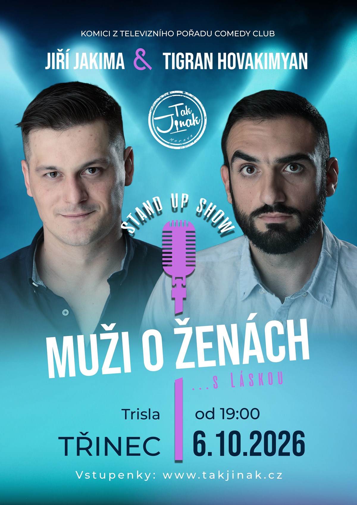 Tigran Hovakimyan a Jiří Jakima / Muži o ženách... s láskouKomici z televizního pořadu "Comedy Club" Tigran Hovakimyan a Jiří Jakima přijíždí do vašeho města, aby bez obalu rozebrali téma muži versus ženy. Chtěli jste vždycky vědět, co si muži myslí o něžném pohlaví, ale báli jste se zeptat? Potom je stand-upová komediální show "Muži o ženách" právě pro vás!