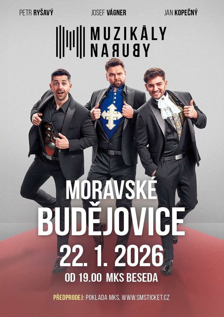 Nejpopulárnější koncertní muzikálová show v ČR míří opět do Moravských Budějovic. A to v takové formě, jak jste je ještě doposud neviděli.Koncertní zábavná show naplněná těmi největšími hity z českých i světových muzikálů.Muzikály Naruby, to je koncert živé kapely, která hraje známe hity tak, jak je ještě nikdy nikdo neslyšel. Přední čeští zpěváci a muzikáloví herci Josef Vágner, Jan Kopečný a Petr Ryšavý zpívají hity nejen z tradičních muzikálů jako jsou Bídníci, Kleopatra, Angelika, Tři mušketýři, ale také z českých hit-muzikálů. V programu tak zní ty největší hity W. Matušky, V. Neckáře, kapely Lucie, J. Ledeckého, K. Gotta, M. Davida, H. Vondráčkové, L. Bílé, H. Zagorové a dalších. Koncert je prokládaný vtipnými historkami ze zákulisí divadla a české hudební scény. Muzikály Naruby tradičně do posledního místa vyprodávají divadelní sály po celé ČR. A nesmíme zapomenout ani na jejich vyprodanou pražskou Lucernu, či O2 Universum.Předprodej vstupenek v síti smsticket.cz a turistickém informačním centru Moravské Budějovice.Vstupné:zóna I - 990 Kčzóna II - 890 Kčzóna III - 790 Kč (přístavek v historickém sále, výhled neomezen)