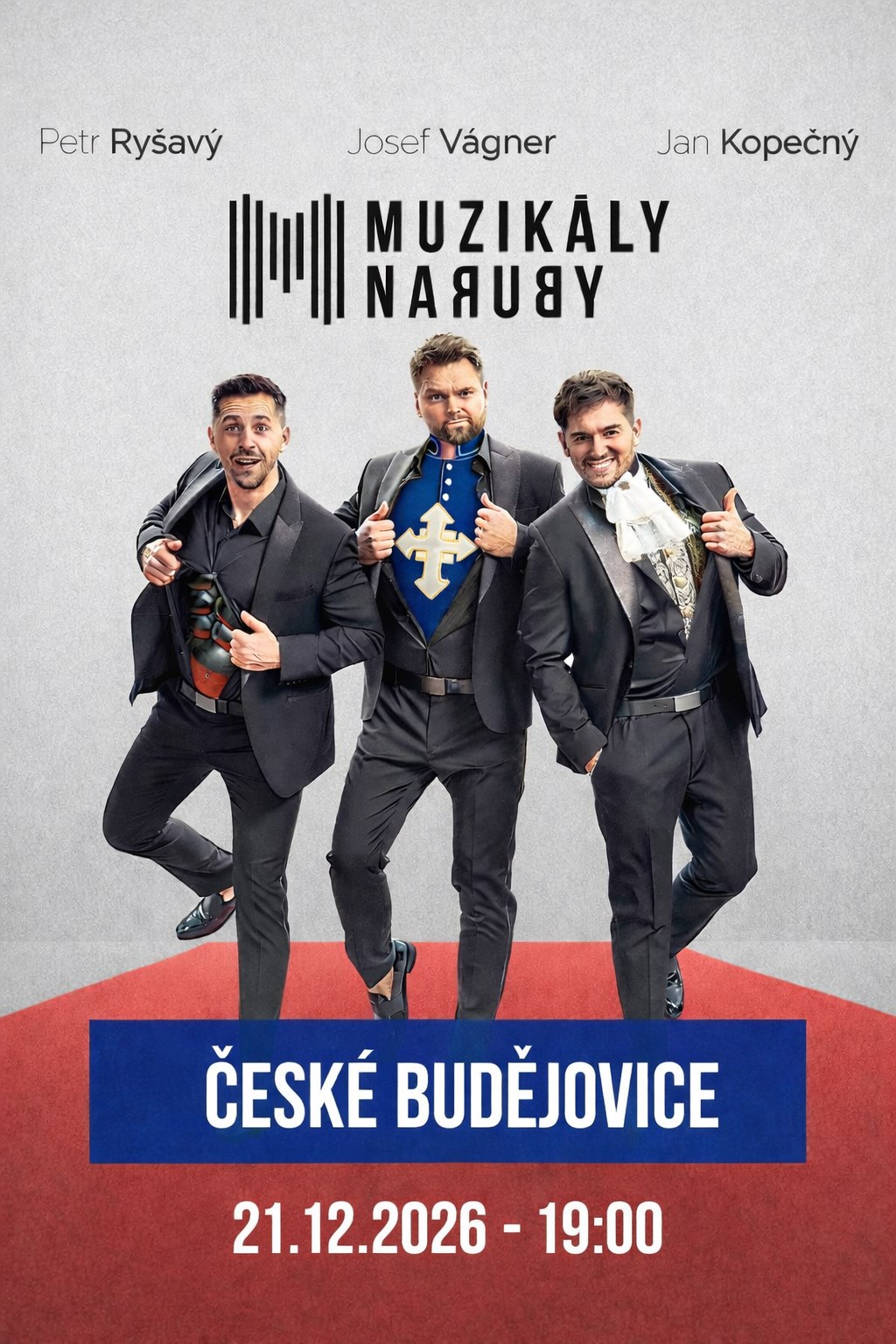 MUZIKÁLY NARUBY - Josef Vágner & Petr Ryšavý & Jan KopečnýKoncertní zábavná show naplněná těmi největšími hity z českých i světových muzikálů.Muzikály Naruby, to je koncert živé kapely, která hraje známe hity tak, jak je ještě nikdy nikdo neslyšel. Přední čeští zpěváci a muzikáloví herci Josef Vágner, Jan Kopečný a Petr Ryšavý zpívají hity nejen z tradičních muzikálů jako jsou Bídníci, Kleopatra, Angelika, Tři mušketýři, ale také z českých hit-muzikálů.V programu tak zní ty největší hity Waldemara Matušky, Václava Neckáře, kapely Lucie, Janka Ledeckého, Karla Gotta, Michala Davida, Heleny Vondráčkové, Lucie Bílé a dalších.Koncert je prokládán vtipnými historkami ze zákulisí divadla a české hudební scény. Muzikály Naruby tradičně do posledního místa vyprodávají divadelní sály po celé ČR. A nesmíme zapomenout ani na jejich vyprodanou pražskou Lucernu.ÚčinkujíJosef VágnerPetr RyšavýJan Kopečný...v doprovodu živé kapely