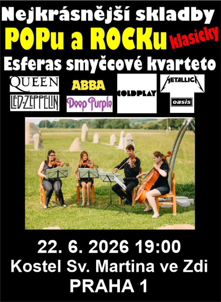 Přijdte se zaposlouchat do zbrusu nového programu, který představí nejkrásnější melodie Popu a Rocku v unikátních aranžích pro smyčcové kvarteto..POP a ROCK klasicky s ESFERAS kvartetemI. housle Ivana MorysováII. housle: Nikola Mikešováviola: Jan Forestvioloncello: Petr Špaček.PROGRAM: QUEEN - We are the ChampionsQUEEN - Show must go onLED ZEPPELIN - KashmirABBA - Money, Money, MoneyCOLDPLAY - Viva la vidaABBA - The Winners takes allCOLDPLAY - Sky full of starsTHE VERVE - Bittersweet SymphonyDEEP PURPLE - Smoke on the waterIMAGINE DRAGONS - Next to meGuns N´Roses - November rainDavid Bowie - Life on MarsEUROPE - Final countdownSCORPIONS - The best is yet to comeOASIS - WonderwallAC/DC - Highway to hellMETALICA - Nothing else mattersRAMMSTEIN - Ohne dich(změna programu a účinkujících vyhrazena) Změna programu a účinkujících vyhrazena.