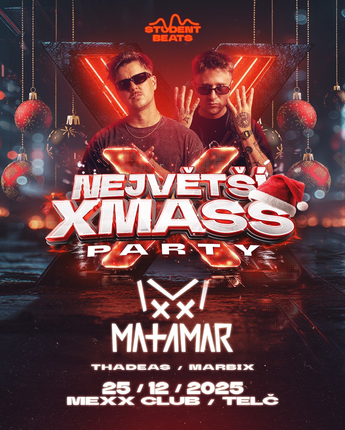 Student Beats ti přináší největší vánoční mejdan v Telči a okolí!NEJVĚTŠÍ VÁNOČNÍ PARTY ROKU! 25. prosince 2025Disco Club MEXX, TelčPo vánoční pohodě doma přichází ta pravá jízda! Dvojice MATAMAR - aneb jedni z nejúspěšnějších cz djs a producentů - rezidentni pražského Duplexu a rádia Evropa 2. Vystoupili v top klubech v Evropě, ale i například v Asii a byli také vybrání jako oficiální warmup act pro The Chainsmokers v pražské Fortuna Aréně. Na svém kontě mají hudební spolupráce se jmény jako Kapitán Demo, Adam Mišík, Sergei Barracuda, Renne Dang nebo Mc Jakob, Mairee a mnoho dalších, kde jen na Spotify evidují více jak 3,5 mil poslechů. Připrav se na show, která tě vyzuje z bot...Support: DJ MarbixLokální legenda, která tě dostane do varu svým energickým setem a perfektním výběrem tracků!Přijď oslavit Vánoce ve velkém stylu — skvělá hudba, světelná show, tanec a ta nejlepší atmosféra ve městě!Start: 21:00Levnější studentské vstupné!
