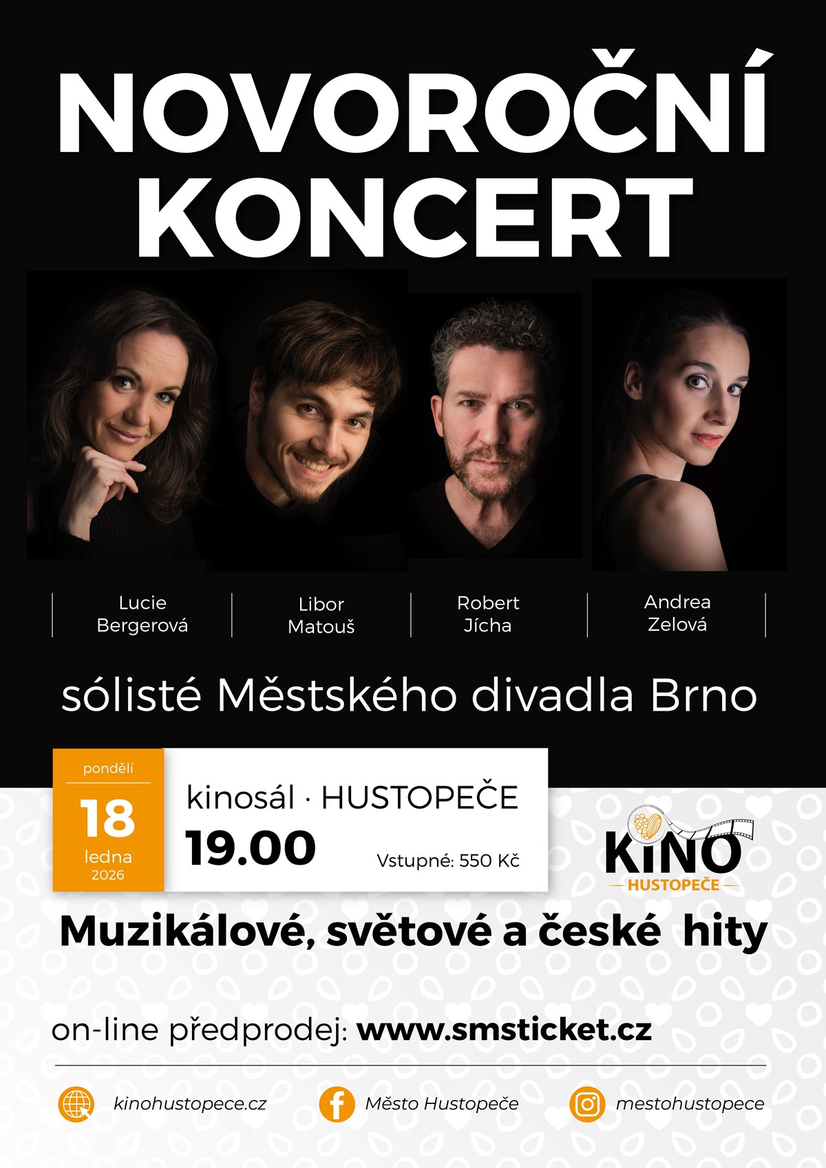 Novoroční koncert v podání sólistů Městského divadla Brno:Libor MatoušRobert JíchaLucie BergerováAndrea ZelováTěšit se můžete na muzikálové, světové a české hity !!!