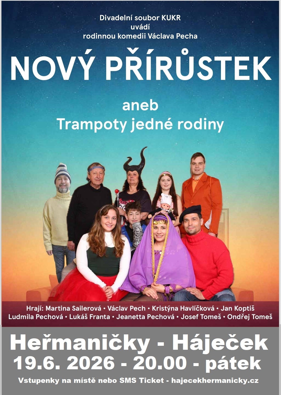 Divadelní soubor KUKR Votice představuje nově nastudovanou rodinnou komedii Václava Pecha -Nový přírůstek aneb Trampoty jedné rodinyKaždá rodina je malý svět — plný vzpomínek, drobných sporů, smíchu i tichého porozumění. A někdy stačí jediná událost, aby se tenhle svět na chvíli roztočil o něco rychleji.Lehká rodinná komedie přináší sled vtipných situací, nedorozumění a jedné "povinné" rodinné akce, do které se mužské části domácnosti tradičně příliš nechce. Setkávají se zde generace, rozdílné pohledy na svět i drobné každodenní starosti, které všichni tak dobře známe.Přijďte se pobavit, zasmát se a možná v některé postavě poznat sami sebe. Protože rodina není dokonalá — ale právě proto je tak blízká a opravdová.