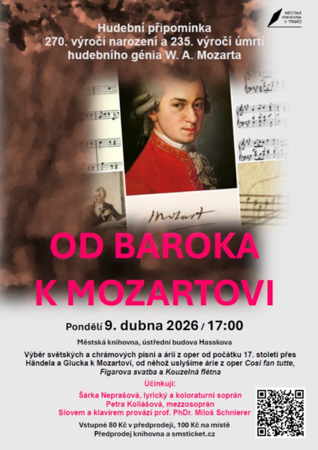 Malá hudební připomínka letošního 270. výročí narození a 235. výročí úmrtí hudebního génia W. A. Mozarta (27.1.1756 - 5.12.1791). Výběr světských a chrámových písní a árií z oper od počátku 17. stol. přes Händela a Glucka k Mozartovi, od něhož uslyšíme árie z oper Cosi fan tutte, Figarova svatba a Kouzelná flétna. Účinkují: Šárka Neprašová, lyrický a koloraturní soprán, Petra Koliášová, mezzosoprán. Slovem a klavírem provází prof. PhDr. Miloš Schnierer.
