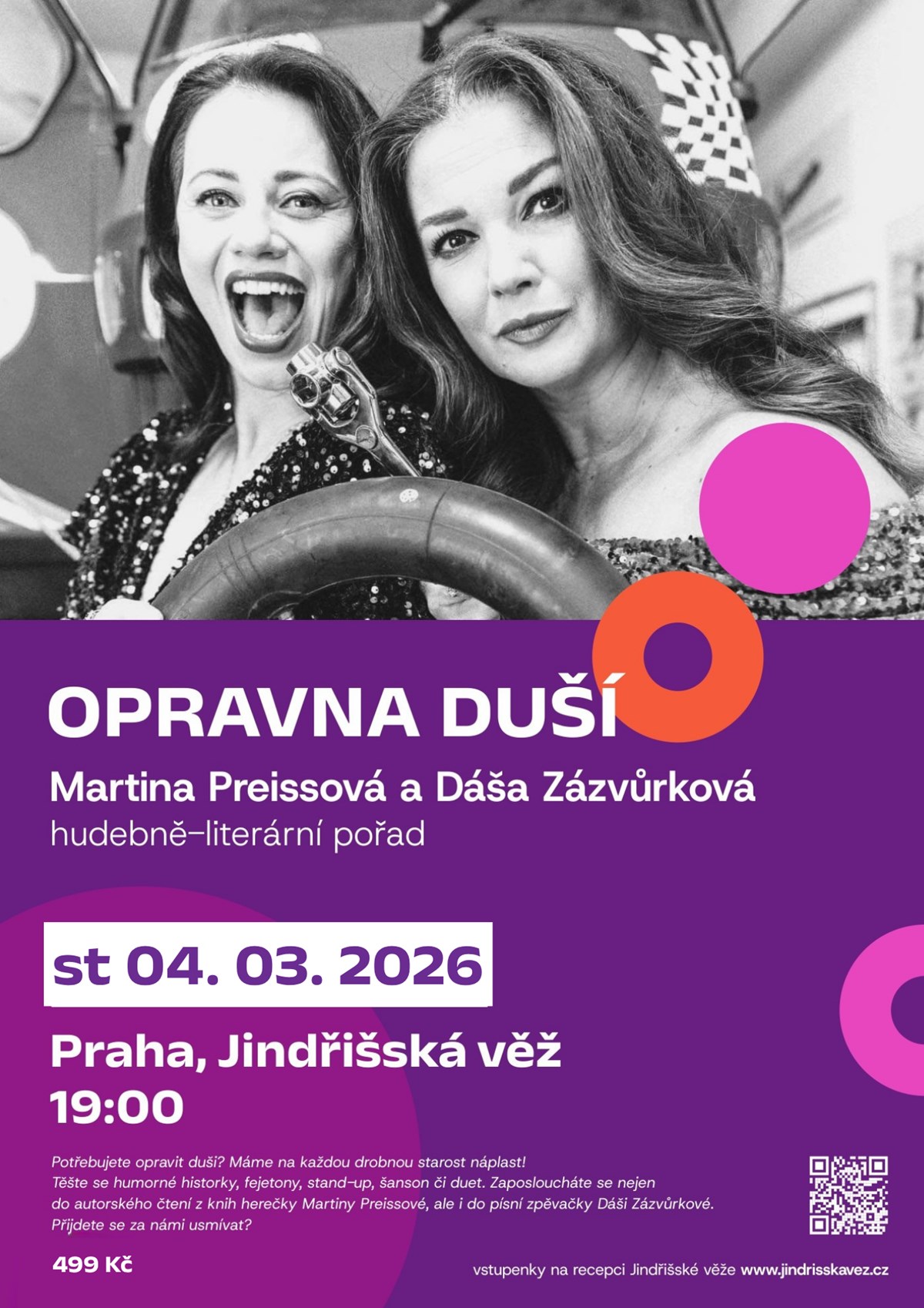 Pojďte spolu s námi zažít večer, kdy vám opravíme vaše dušeMáte manžela? Máte manželku? Jste svobodní? Jste málo šťastní, nebo příliš bezstarostní? Cítíte se někdy sami, nesnášíte nakupování, nebo trpíte nadváhou? Máme lék na mnoho vašich starostí. A jak to děláme? Donutíme vás na ně během našeho pořadu zapomenout! Na každou vaši drobnou starost máme náplast ve formě duetu, fejetonu, stand upu nebo sólového šansonu. To vše z naší autorské dílny a s notnou dávkou humoru.Zaposloucháte se nejen do autorského čtení z knih herečky a autorky Martiny Preissové ale i do písní zpěvačky a herečky Dáši Zázvůrkové. Uslyšíte povídky z knihy „Jak jsem nebyla na lvech“ a „Mají v nebi skleničky?“, které vám přečte sama autorka, a máme pro vás připraveno i několik písní, které vznikly ve společné dílně obou protagonistek. A je toho mnohem víc, co v naší společné dílně vzniklo. Nemějte strach, že je to nějaká chvilka poezie! Je to setkání dvou žen na jevišti, která každá po svém a někdy i dohromady opravují duše těm, kteří se chtějí zasmát a zamyslet. Nechte se strhnout rytmem našich temperamentů a slibujeme, že cestou domů si ještě stále budete zpívat a usmívat se. Opravářky vašich dušíMartina Preissová je česká divadelní, televizní a filmová herečka. Od roku 2000 je stálou členkou činoherního souboru Národního divadla v Praze a hostuje i na jiných pražských scénách. Byla dvakrát (1999, 2004) nominována na Cenu Thálie. V roce 2021 napsala svoji prvotinu. Soubor povídek ze života, knihu Jak jsem nebyla na lvech a jiné příhody a následně vydala povídkový román Mají v nebi skleničky?. A můžete ji znát i jako televizní herečku ze seriálů Nemocnice na kraji města, Anatomie života, Slunečná či Kamarádi a také z filmů Probudím se včera, Matky a dalších.Dáša Zázvůrková je česká zpěvačka a herečka. Vystudovala nonverbální a komediální divadlo na HAMU u Borise Hybnera a italianistiku na Filozofické fakultě Univerzity Karlovy. V letech 2003–2014 byla externí členkou divadla SEMAFOR. Hrála také roli Vanilky v jazzové opeře Dobře placená procházka v Národním divadle (2007). V současné době se věnuje autorské tvorbě a můžete ji znát i z úspěšného představení Můžem i s mužem. Aktuálně slaví úspěchy s projektem Pocta Haně Hegerové, kde interpretuje hity legendy českého šansonu. Koncert V barvách semaforu přináší to nejlepší z tvorby Suchého a Šlitra.