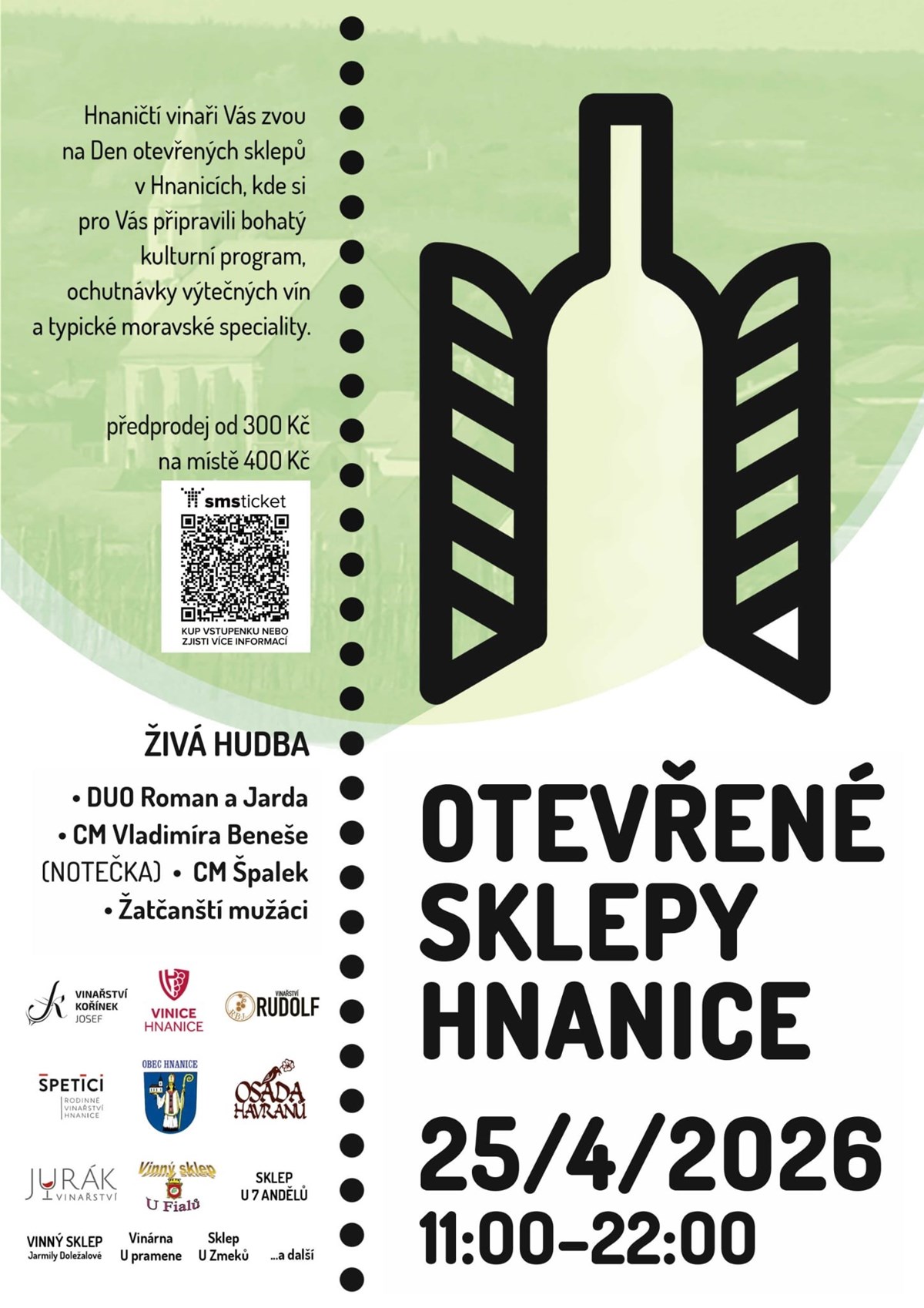 Sklenička, mapka a jde se degustovat 🙂Vstupné v předprodeji je ve dvou vlnách. První vlna při zakoupení do 31.3.2026 je 300,- Kč, druhá vlna do 25.4.2026 do 0 hodin je 350,- Kč. Pak na místě 400,- Kč a obsahuje skleničku, dva poukazy na nákup lahví vína(2x 100,- Kč), mapku otevřených sklepů, pásku.Samozřejmostí je degustace vín v nejméně dvaceti sklepech. Stručné informace k průběhu akce: Skleničky budou k dostání na Informačních místech na začátku a koci sklepní uličky ( na mapce označené jako INFO ) Hradí se jednotlivé vzorky ve sklepích ( ceny jsou v režii vinaře)Bude znovu posílené autobusové s pojení Znojmo - Hnanice a zpět Atmosféru doladí na náměstíčku na začátku sklepní uličky Kulturní program - 12- 15 hod CM Špalek 15 -19 hod CM Ladislava Beneše (NOTEČKA) 19 - 23 hod DUO Roman a Jarda Od 14 hodin budou sklepní uličkou zpívat Žačanští mužáci a Harmonikář Opět můžete během letošního ročníku využít aplikaci Vinařského asistenta, kterou budou moci využít návštěvníci při Dnech otevřených sklepů v Hnanicích.Odkaz https://hnanice.ad4wine.com/