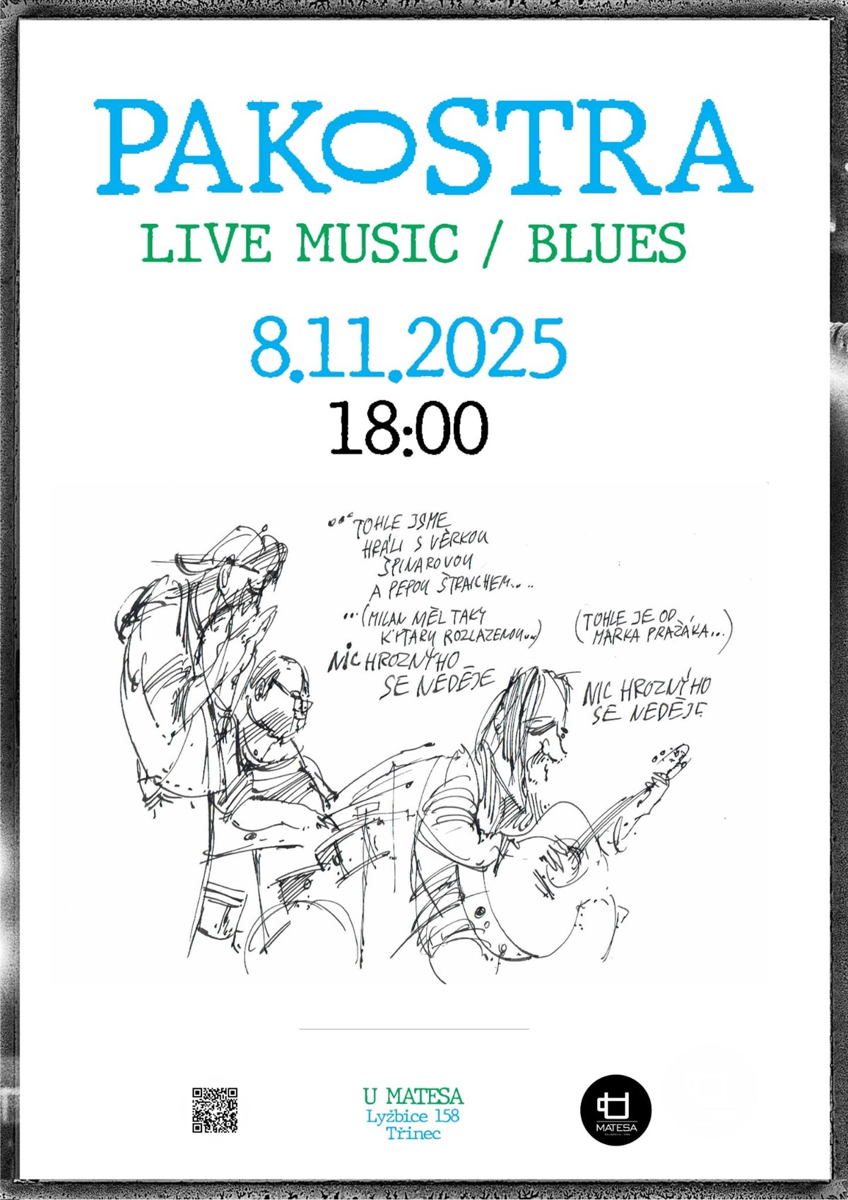 PAKOSTRA.. Ostravská bluesová kapela, kde převažuje vlastní autorská tvorba a bluesove evergreens...Složení, ve kterém budem hrát:Jiří "Kosťa" Kostadinov - ak. kytara, zpěv [ostravská bluesová legenda]Josef Pak "Joe After" - kontrabas, zpěv Oskar Kraina - foukací harmonika, zpěvJan Hroch - elektrická kytaraJiří Symanek - bicíSTART:18:00ENTRY:100 CZK v předprodeji150 CZK na místě