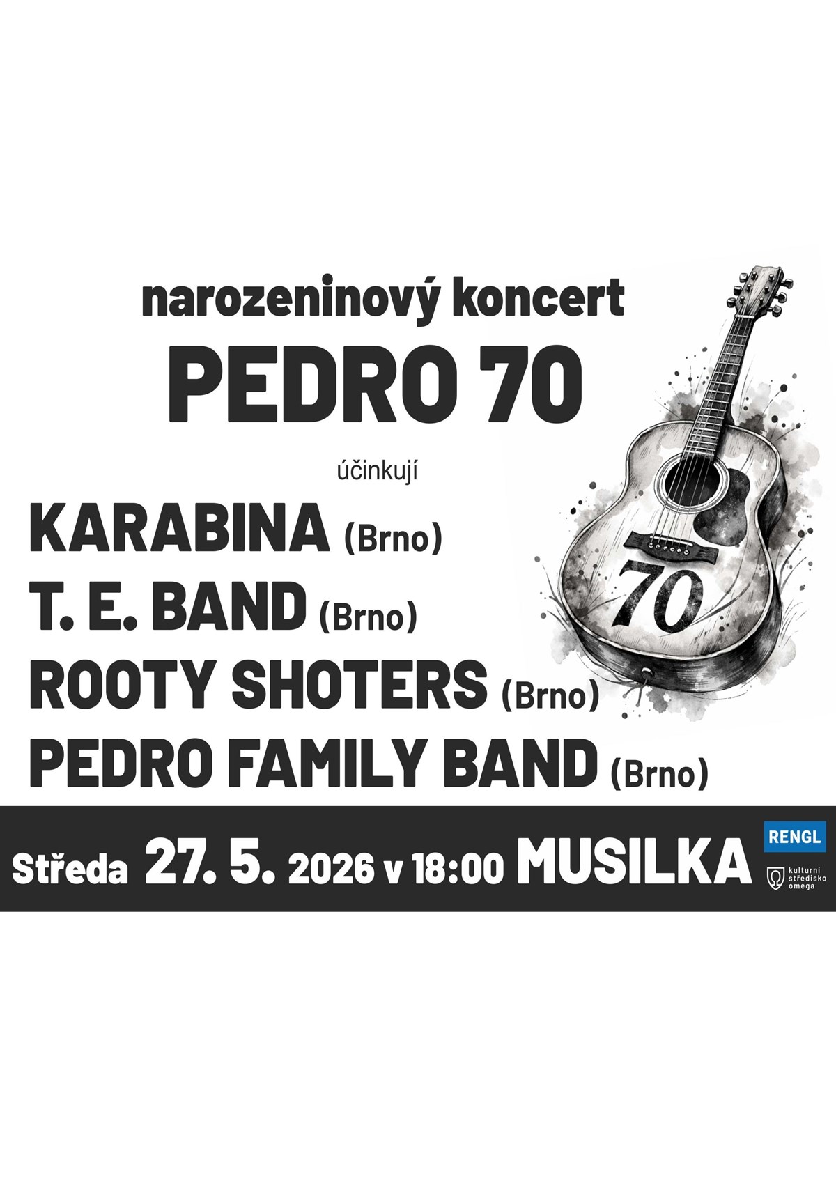 PEDRO 70 - KarabinaNarozeninový koncert.Gratulovat budou: KARABINA (Brno)T. E. BAND (Brno)PEDRO FAMILY BAND (Brno)ROOTY SHOOTERS (Brno)Průvodní slovo Jiří "Jordán" Vobora