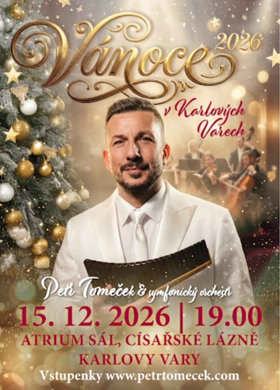 Dovolujeme si Vás pozvat na výjimečný vánoční večer, který se odehraje v jednom z nejkrásnějších a nejreprezentativnějších měst Evropy.Petr Tomeček / Vánoce 2026 v Karlových Varech je slavnostní koncert, jenž propojí kouzlo Vánoc s noblesou světoznámého lázeňského města, jehož elegance, klid a nadčasová krása vytvářejí dokonalou kulisu pro mimořádný kulturní zážitek.Karlovy Vary – město tradic, umění a vytříbeného vkusu – se stanou dějištěm exkluzivní vánoční show, která dalece přesahuje rámec běžného koncertu. Večer bude oslavou hudby, emocí a sváteční atmosféry v té nejvyšší kvalitě.Hlavním hudebním nástrojem koncertu bude Panova flétna – výjimečný a podmanivý nástroj s jemným, hřejivým tónem, který v sobě nese klid, hloubku a duchovní rozměr. Její zvuk se v tomto programu stává symbolem Vánoc – čistým, meditativním a zároveň silně emotivním.Petr Tomeček vystoupí za doprovodu živého orchestru a kapely, čímž vznikne bohatý a slavnostní hudební celek. Program dále obohatí dětský pěvecký sbor, jehož hlasy vnesou do večera nevinnost a kouzlo svátečních tradic, spolu s moderními tanečníky a baletem, kteří dodají koncertu eleganci, lehkost a vizuální působivost.Zazní světové i české vánoční melodie a hity, sváteční skladby v moderních, originálních aranžmá, vytvořených speciálně pro tento projekt. Hudba se zde propojí s pohybem, prostorem a atmosférou lázeňského města v harmonický celek, který osloví všechny smysly.Tento koncert je určen publiku, které vyhledává výjimečné kulturní události, vysokou uměleckou úroveň a neopakovatelný zážitek. Vyšší cena vstupenky tak reflektuje rozsah účinkujících, špičkovou produkci i jedinečnost večera, jenž se stane důstojnou součástí vánoční tradice Karlových Varů.Prožijte Vánoce 2026 v duchu klidu, elegance a hudby, která hladí duši.V prostředí, kde se čas zpomaluje a sváteční okamžiky získávají skutečnou hloubku.